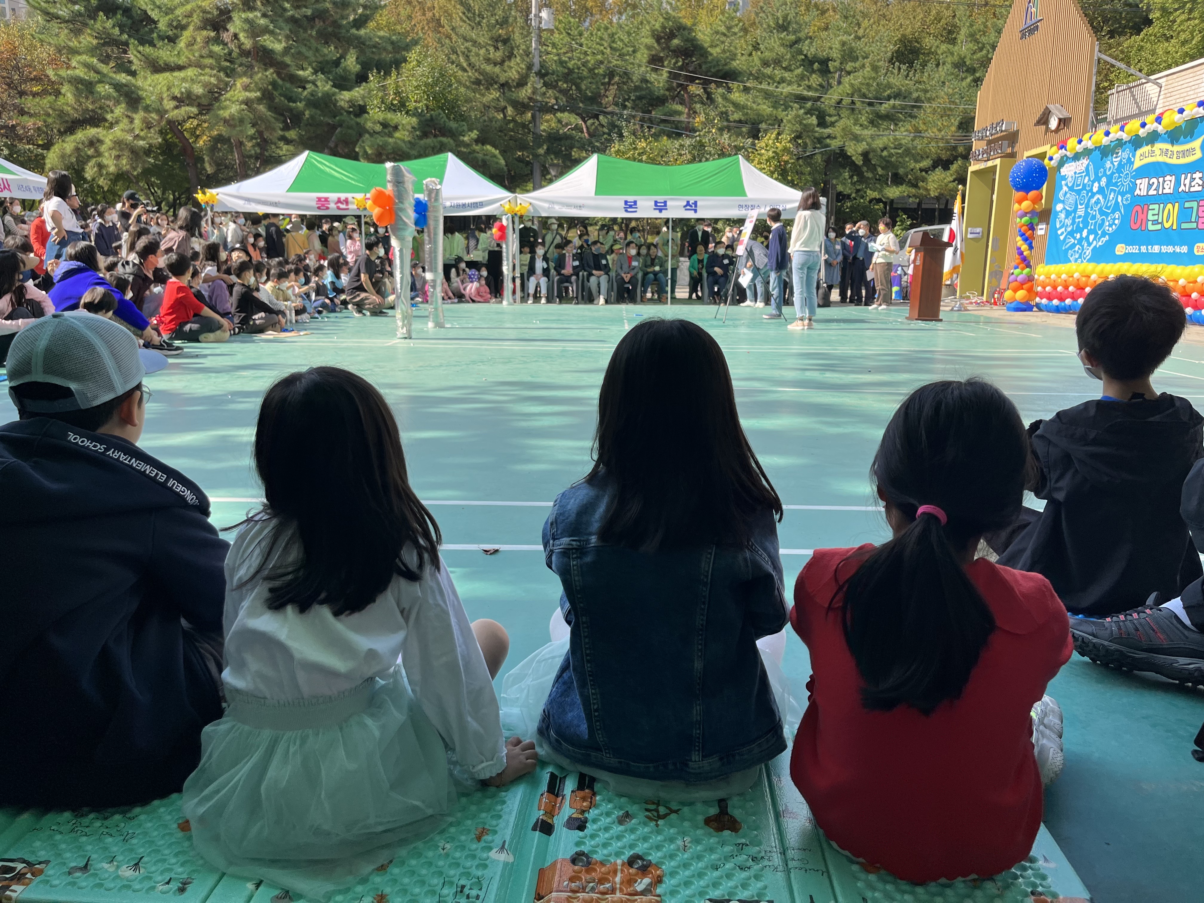 풍선과 현수막으로 장식된 야외 무대 주변으로 아이들이 한껏 기대하며 앉아있습니다.