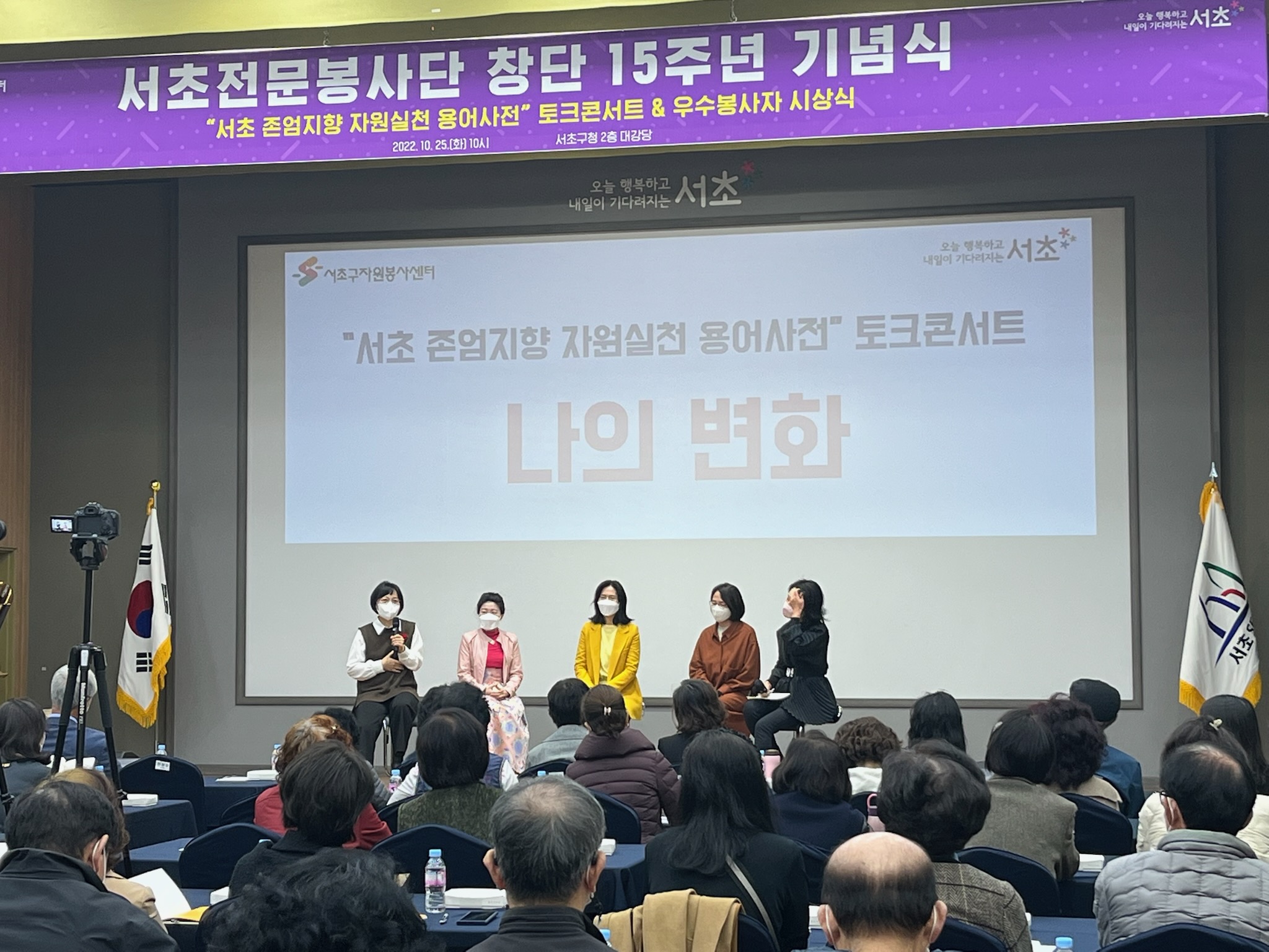 이렇게 패널분들과 '서초 존엄지향 자원실천 용어사전'을 제작하면서 경험했던 그리고 변화된 모습을 청중들과 공유하는 시간을 가지며, 앞으로 자원실천 현장에서 존엄을 생각하고 우리가 먼저 존엄을 실천하자는 내용을 담아 토크콘서트가 종료되었습니다.