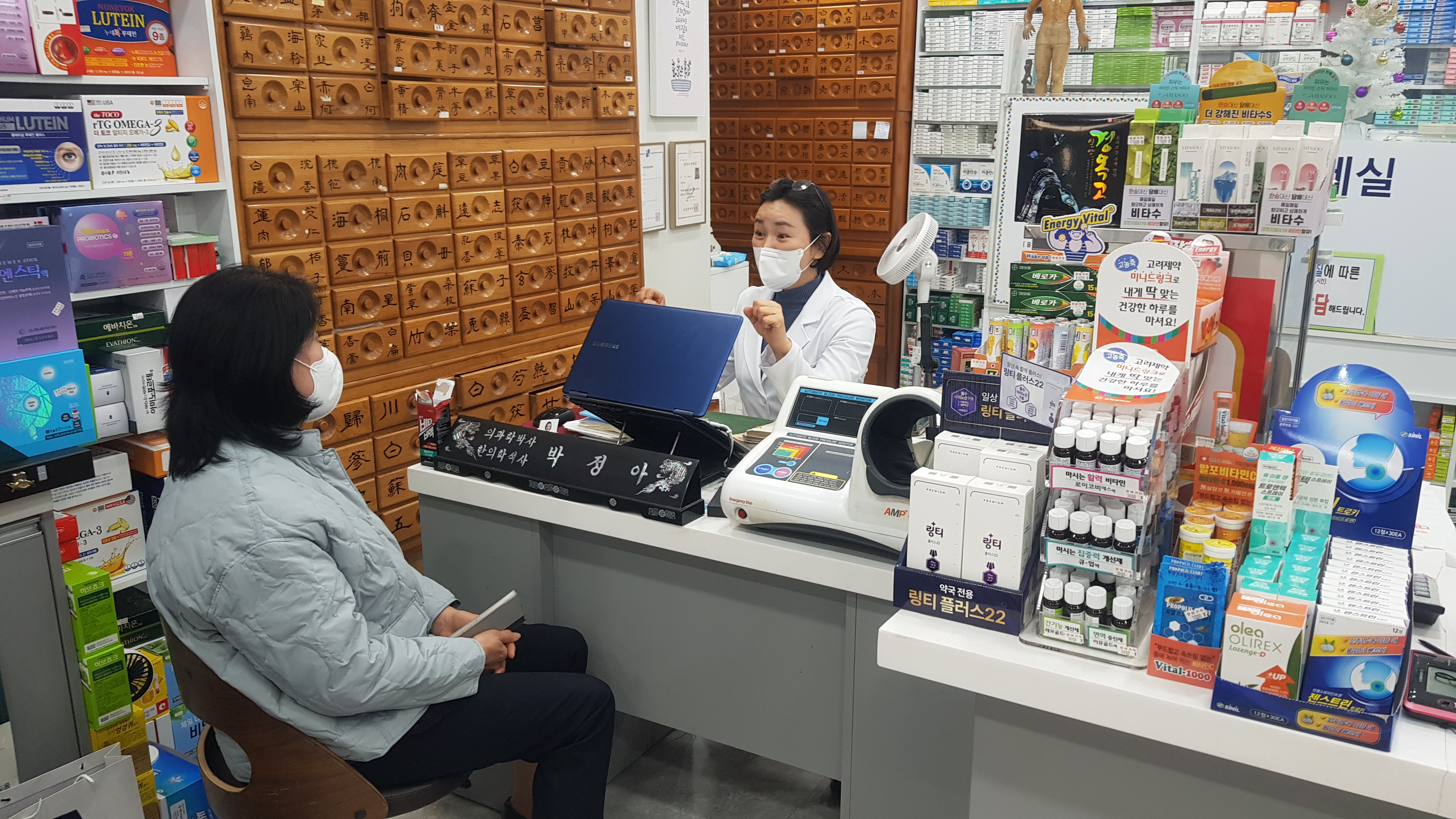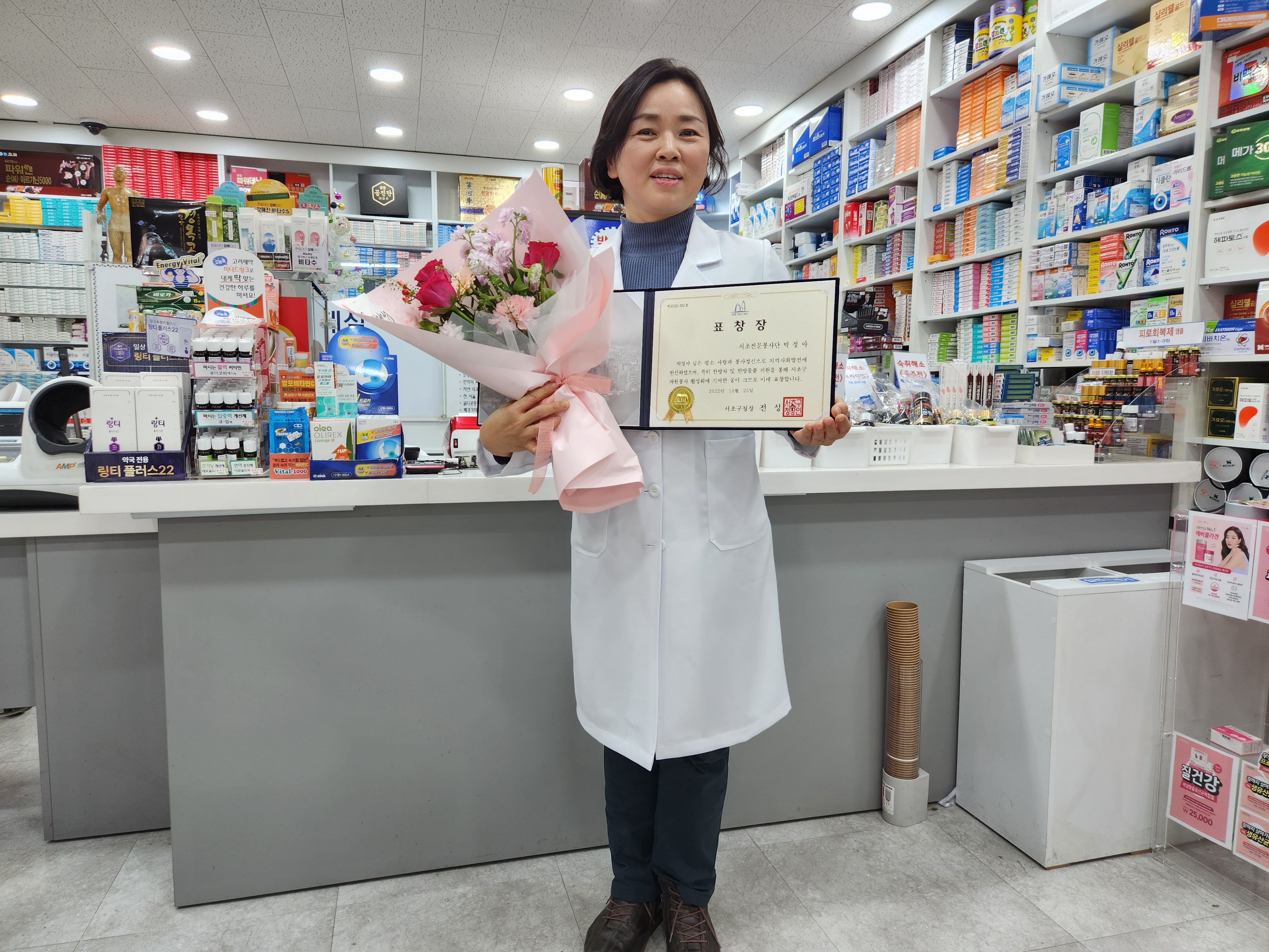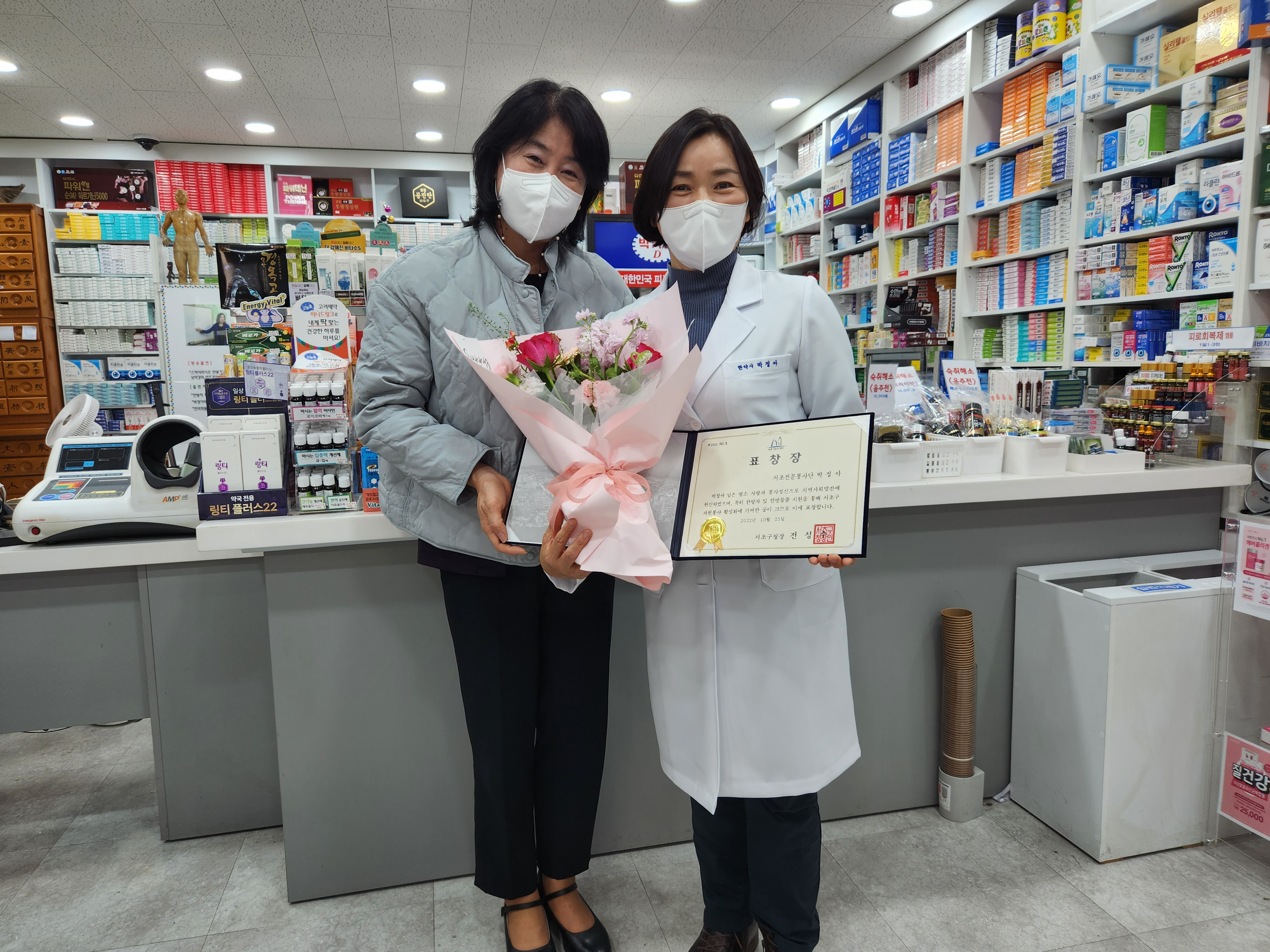 박정아 회장님이 운영하시는 약국에 왔습니다. 김유미 서초구자원봉사센터장님과 함께 건강한 미팅을 진행하면서 다양한 이야기를 나누고 미팅 이후 서초구청장상 수여식을 진행했습니다.