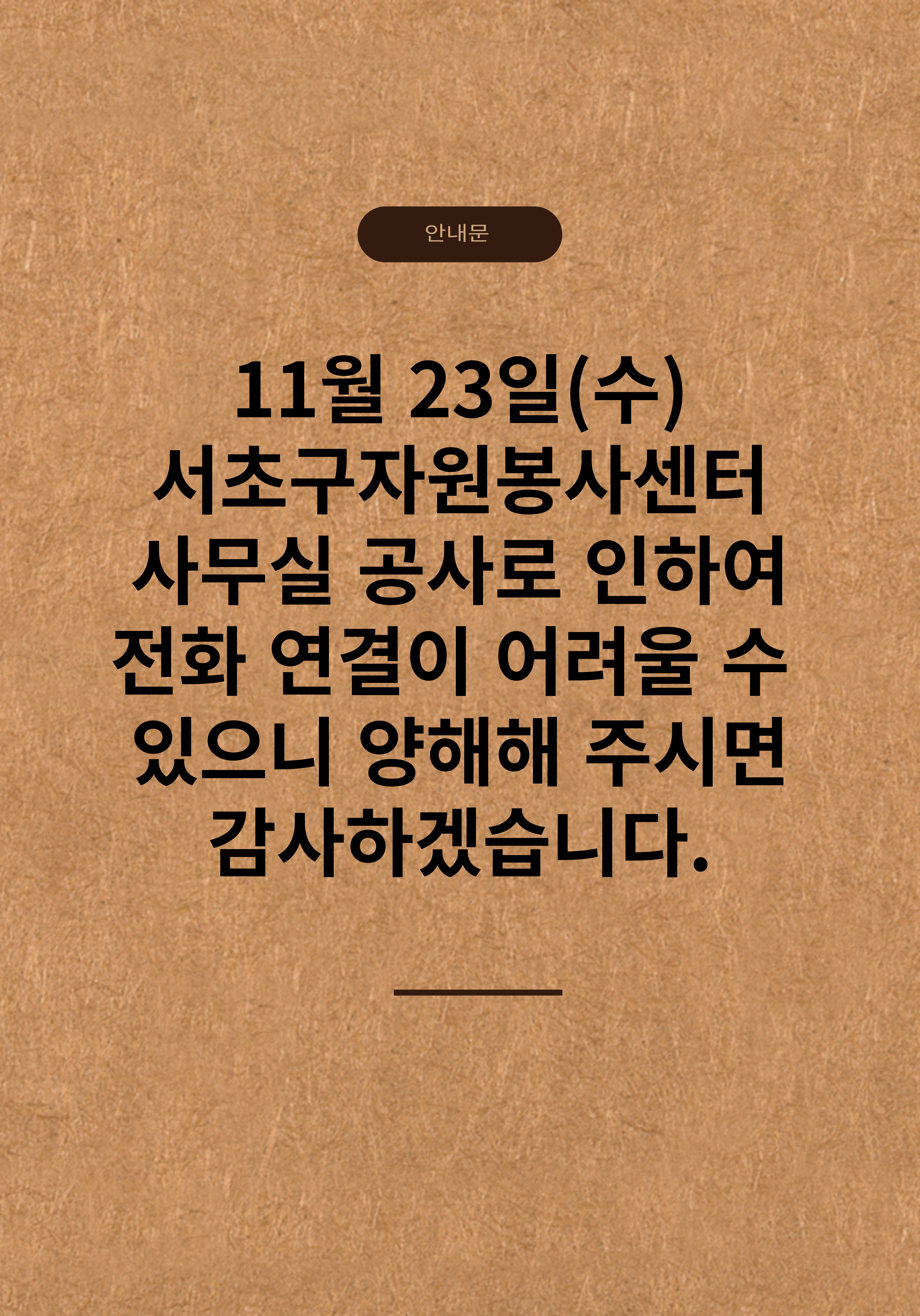 2022년 11월 23일(수) 14시-16시, 서초구자원봉사센터 사무실 공사로 전화 연결이 어려울 수 있습니다. 양해바랍니다.