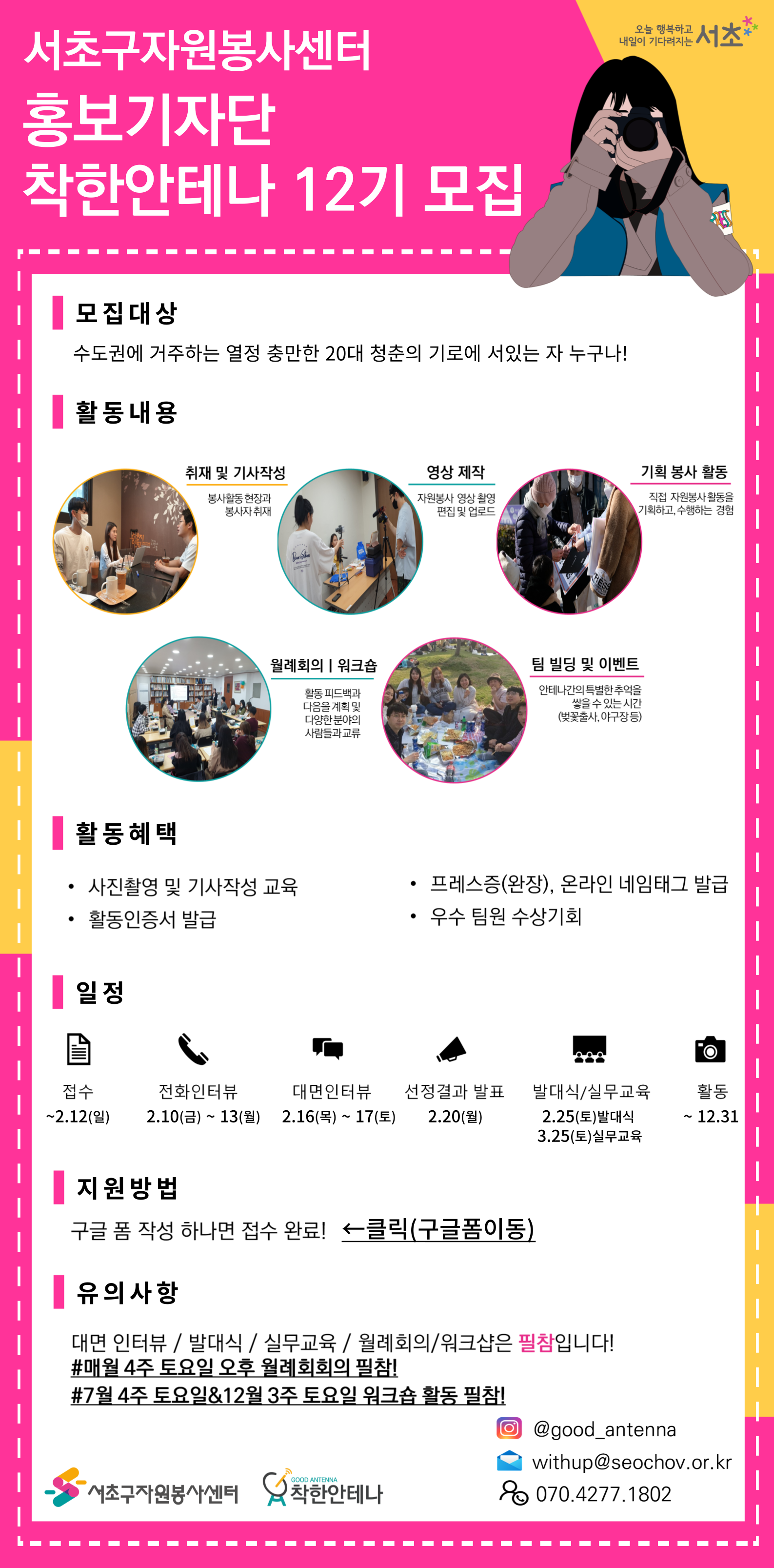 서초구자원봉사센터에서는 센터의 소식을 알리고 서초구의 착한 소식을 전하는 홍보기자단 착한안테나 12기를 모집합니다!