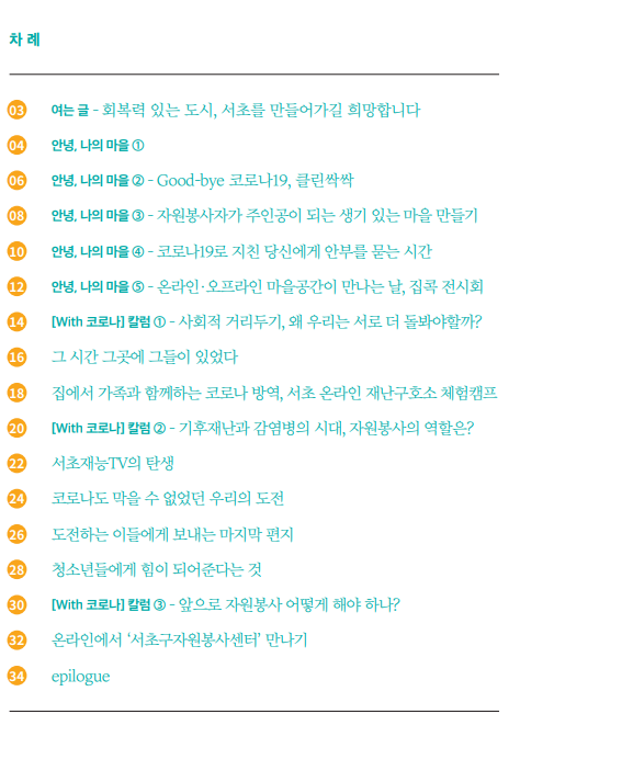 기존의 양적 숫자와 글자 위주의 성과보고서에서 벗어나 실제 자원봉사를 통해 지역사회에서 일어나고있는 변화를 사진과 이야기로 담은 서초구자원봉사센터의 여섯번째 성장보고서 입니다.