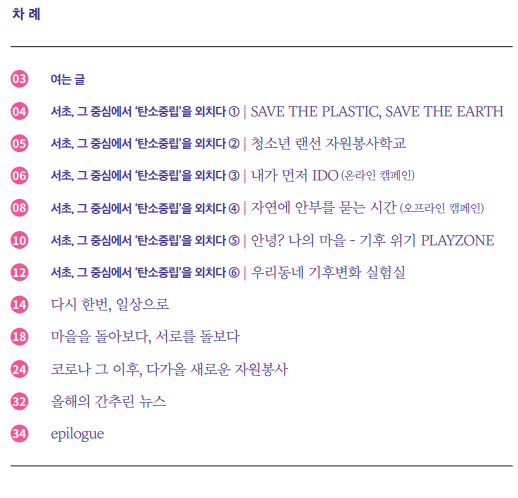 기존의 양적 숫자와 글자 위주의 성과보고서에서 벗어나 실제 자원봉사를 통해 지역사회에서 일어나고있는 변화를 사진과 이야기로 담은 서초구자원봉사센터의 일곱번째 성장보고서 입니다.