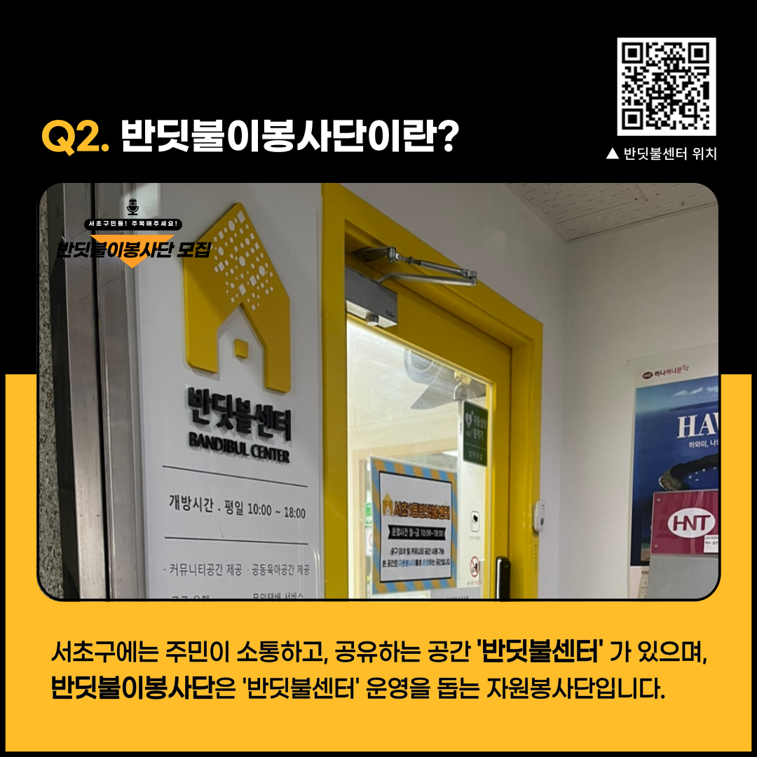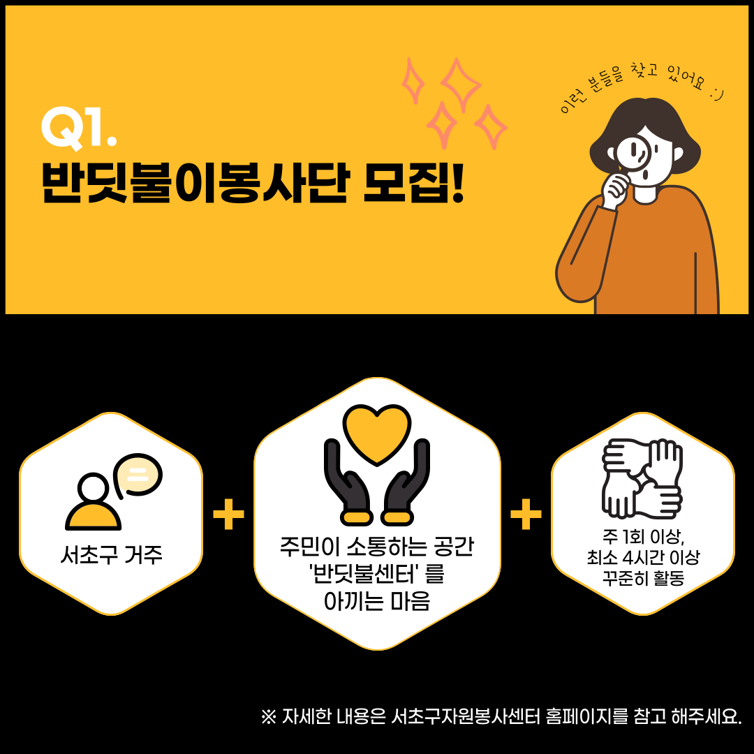 '서초구 거주' 하고, '주 1회 이상 최소 4시간 이상 꾸준히 활동' 하실 분, 가장 중요한 것은 주민소통공간 '반딧불센터' 를