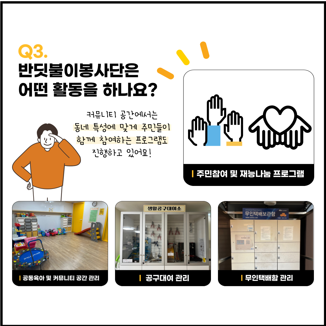 반딧불이봉사단은 반딧불센터에서 공구대여 안내, 무인택배함 관리, 공동육아 및 커뮤니티 공간 관리 등의 활동을