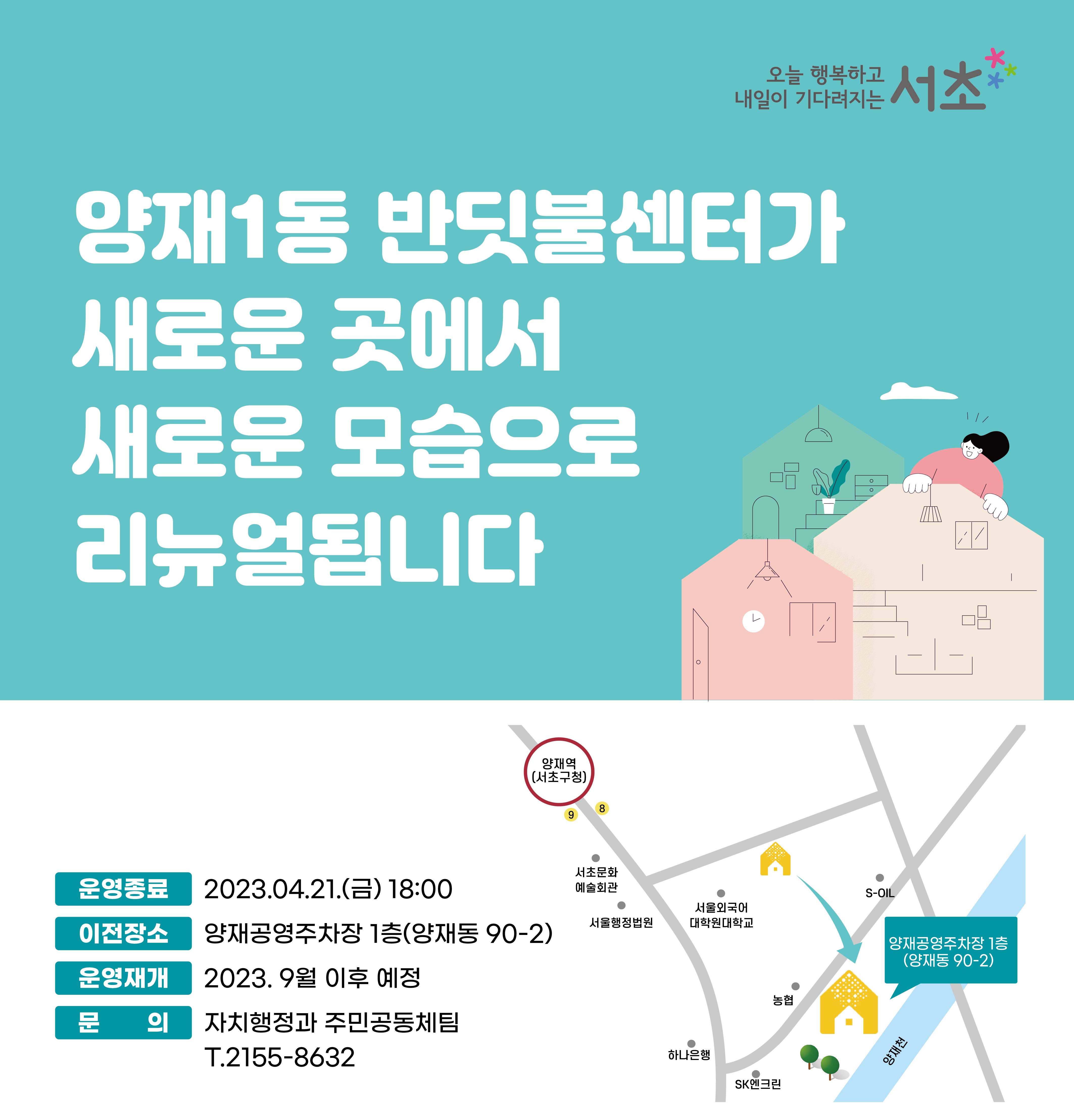 양재1동 반딧불센터는 새로운 공간에서 새로운 모습으로 리뉴얼 후, 9월 이후 재운영 예정입니다.