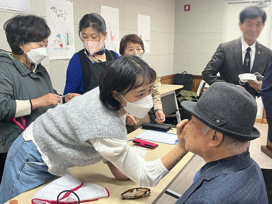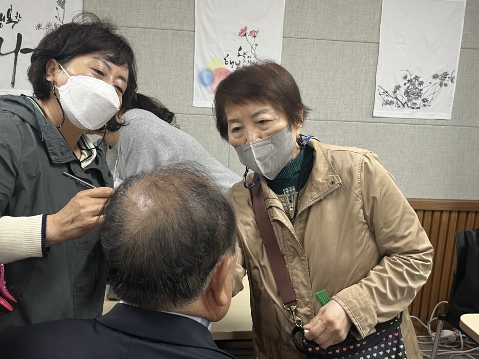 이미용 봉사단 행복나누기봉사단의 경우 리더 노길자 단장님을 포함한 7명의 자원봉사자들이 참여하셨으며 가벼운 이발 및 메이크업으로 촬영을 위한 사전 준비를 맡아 진행하였습니다. 행복나누기봉사단원분들께서는 어르신들 한 분 한 분 눈썹정리를 하고, 가벼운 선크림과 입술을 발라 더욱 생기있는 사진촬영 현장이 되었습니다.