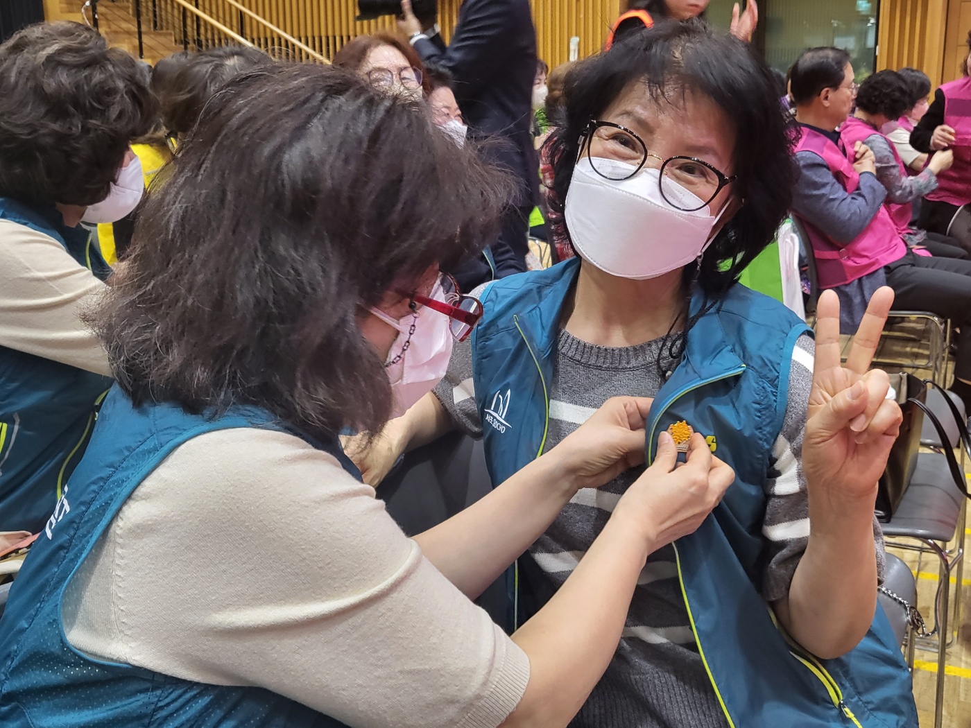 서울시 대표 꽃인 '개나리'를 상징하는 예쁜 뱃지를 서로에게 달아주는 세레머니와
