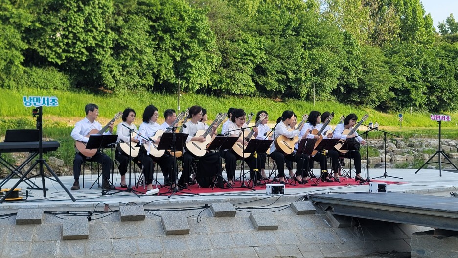 다음은 서초기타오케스트라입니다. 서초구 내에서 클래식 기타를 배우는 봉사자들이 앙상블을 꾸려서 공연봉사를 진행하고 있습니다. 헝가리 무곡 5번과 더불어서 베사메무쵸, 알함브라 궁전의 추억을 멋진 자연과 어울리게 연주해주셨습니다.