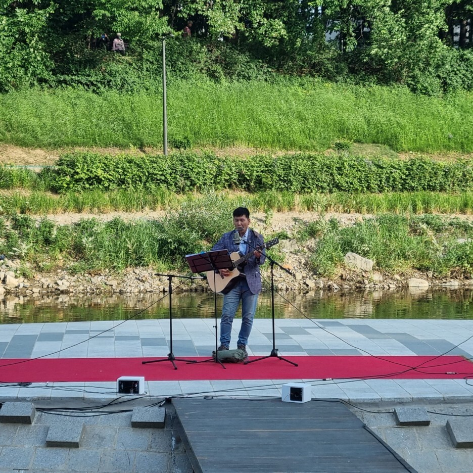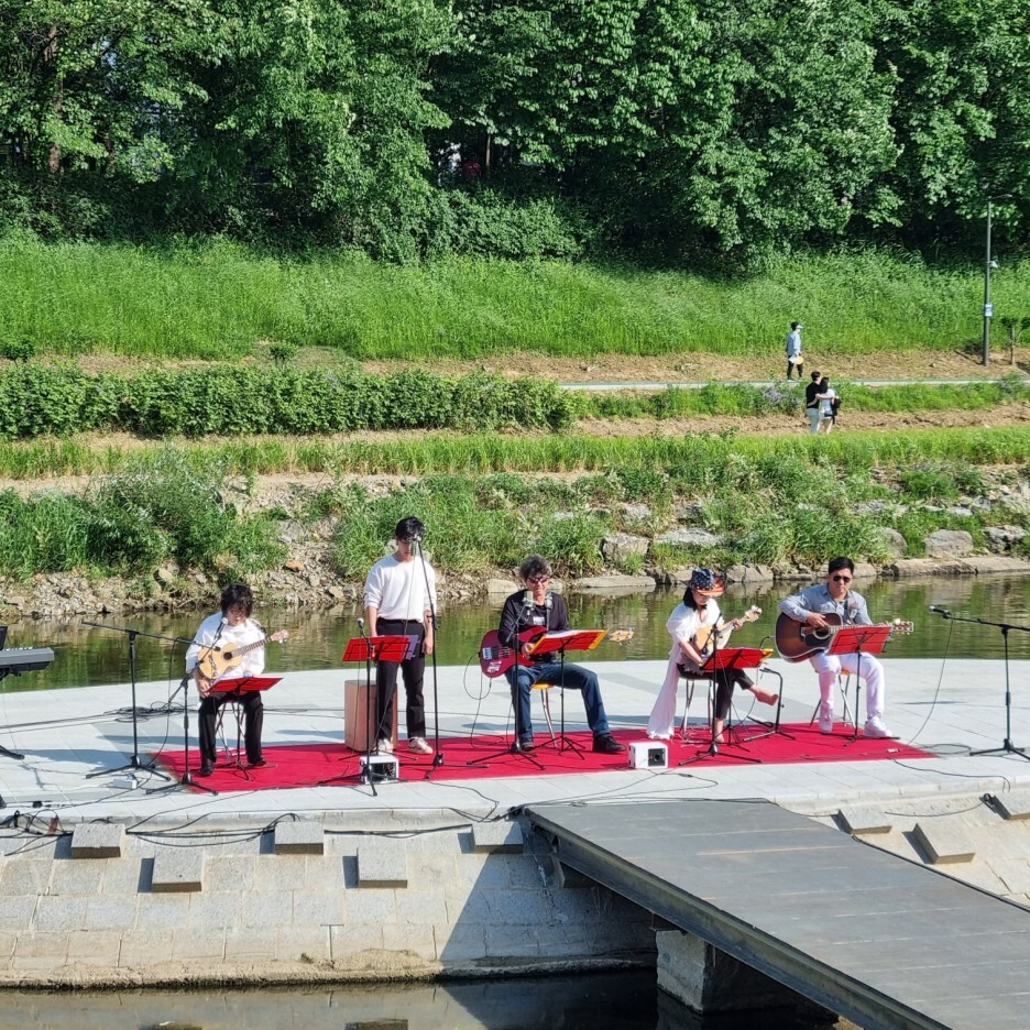 첫 공연타자는 어쿠스틱밴드 반포자이앙상블의 무대였습니다. 잔잔한 기타연주와 함께 청량한 보컬의 노래가 양재천을 가득 메웠습니다.