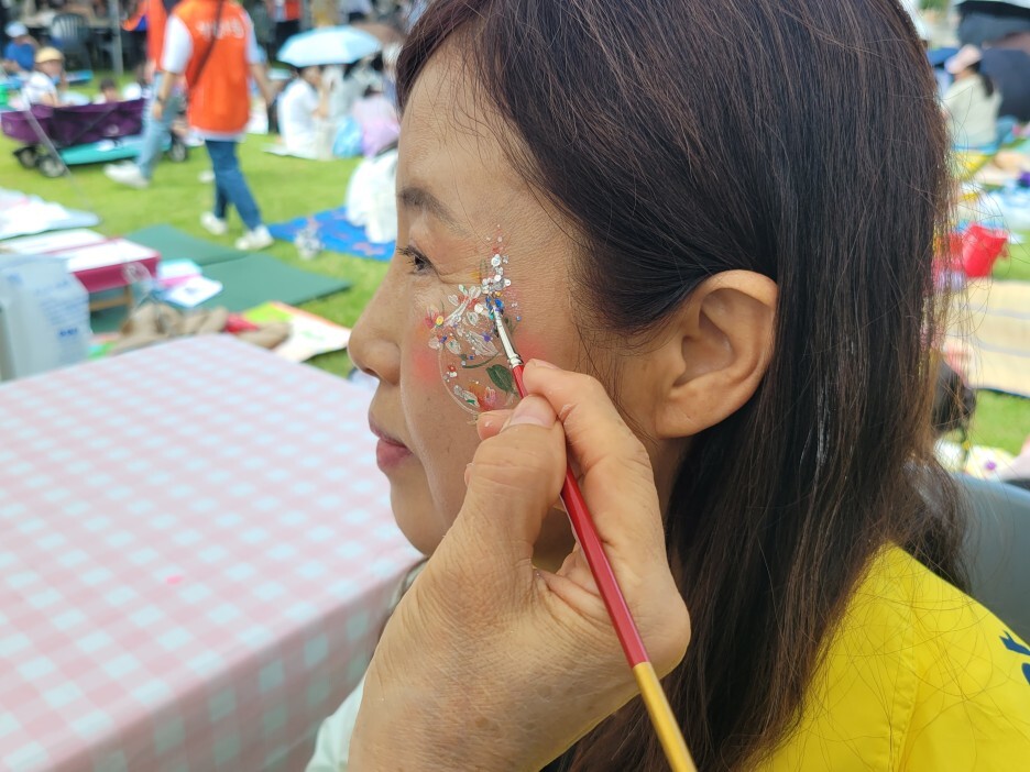 자원봉사자 분들의 금손으로 얼굴의 예쁜 문양을 그려주시는데요~ 저도 한 번 받아보고싶었지만 줄이 너무 길어 받지 못한게 아쉬울 따름입니다. 여러가지 색깔들이 조화롭게 채색된 모습이 예쁘지 않나요?