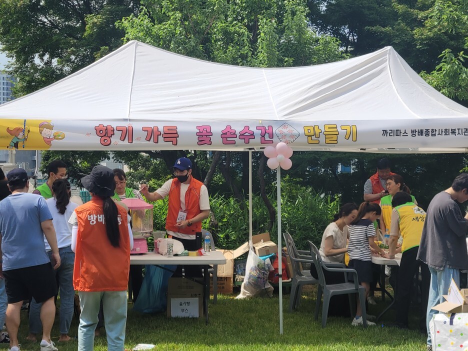 행사하면 먹거리 코너를 빼놓을 수 없죠! 방배 1동 바르게 살기 위원회에서 맛있는 먹거리를 판매했습니다. 샌드위치, 소떡소떡, 인절미 등 듣기만해도 군침도는 음식들은 활동을 열심히 하느라 허기진 배를 채우기 충분했습니다. 저렴한 가격덕분에 금전적인 부담을 덜 수 있어 음식들이 불티나게 팔려나갔답니다.