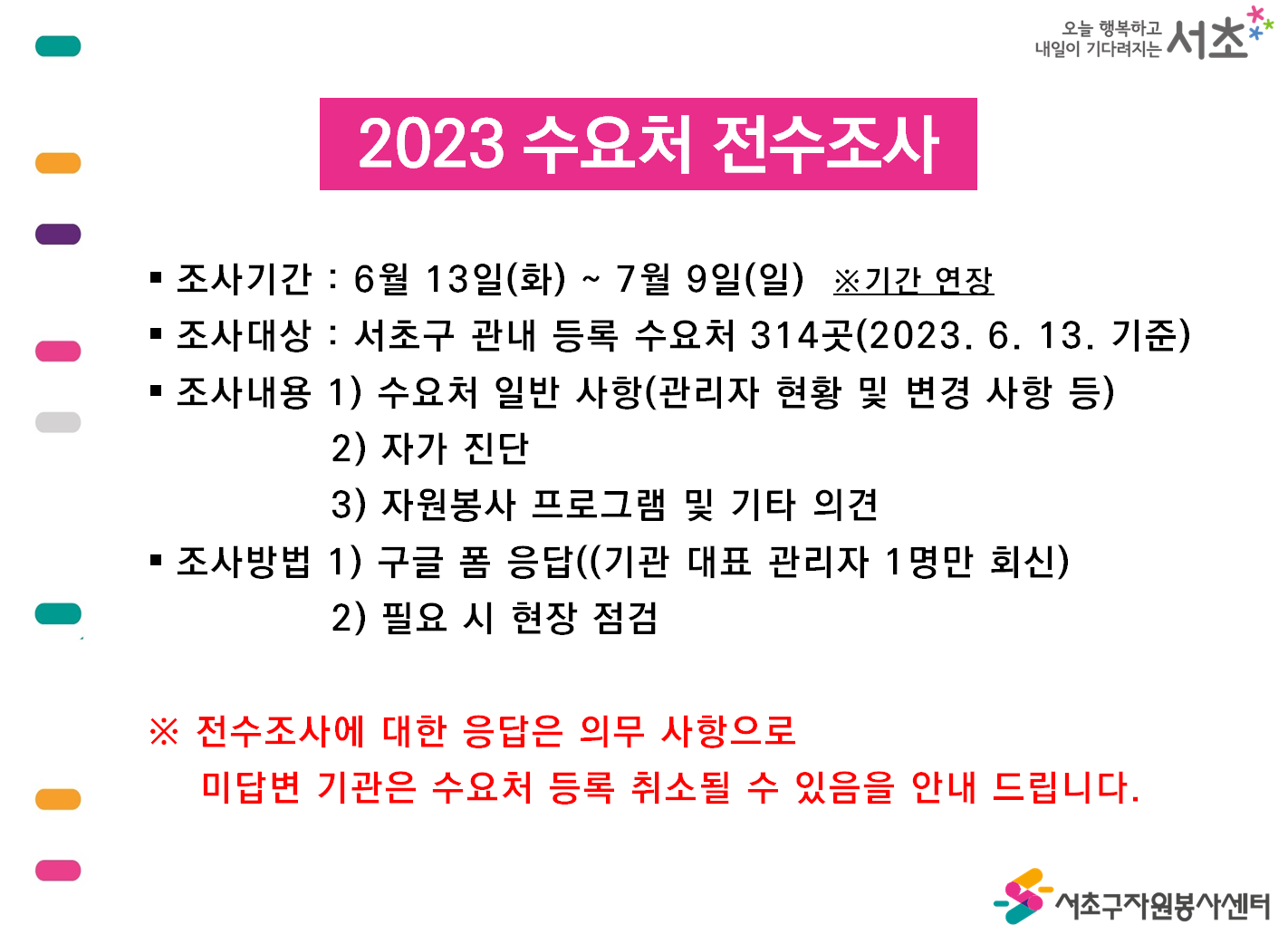 서초구자원봉사센터에서는 「자원봉사 활성화를 위한 자원봉사센터 운영지침」(행정안전부)에 따라 수요처를 관리하고 있습니다. 이에 수요처 정보를 현행화함으로써 수요처를 안정적으로 관리 지원하기 위하여 아래와 같이 전수조사를 실시하오니 협조하여 주시길 바랍니다.