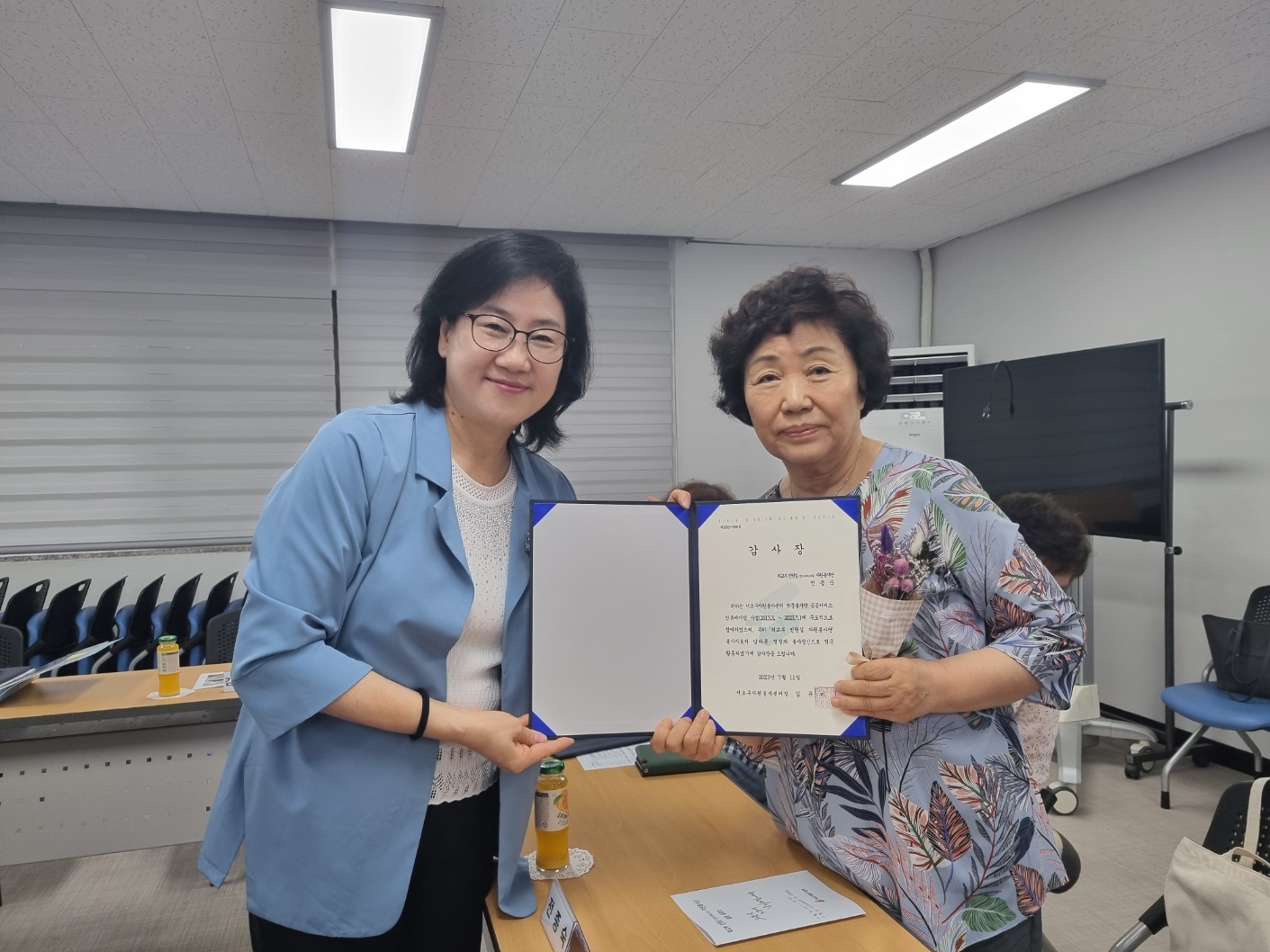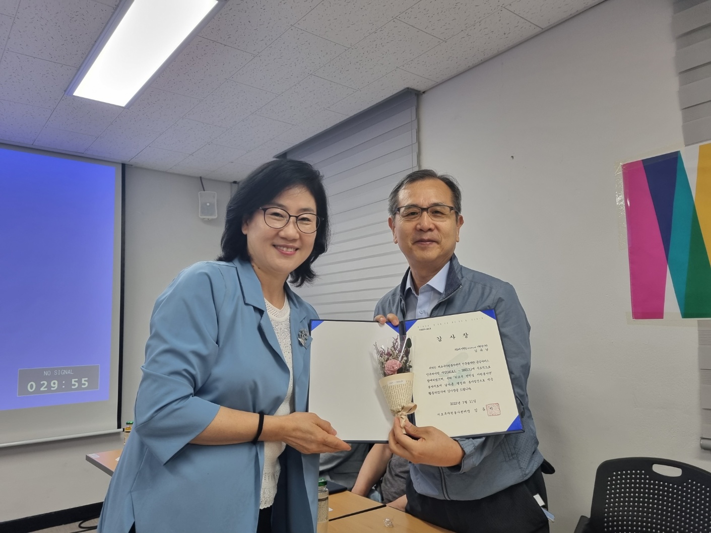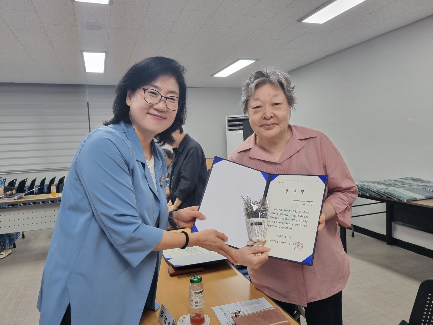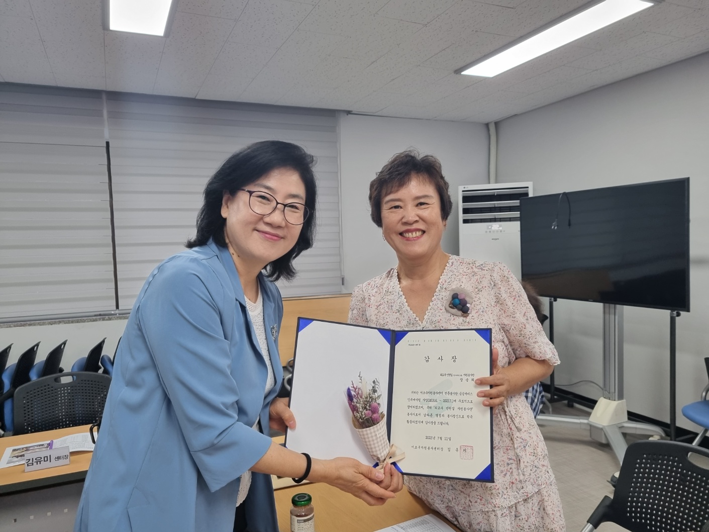 다음으로는 봉사자분들께 감사장을 수여하는 시간을 가졌습니다. 감사장과 꽃다발 수여는 김유미 센터장님이 맡아주셨고, 봉사자 분들과의 기념사진 촬영도 진행했습니다.