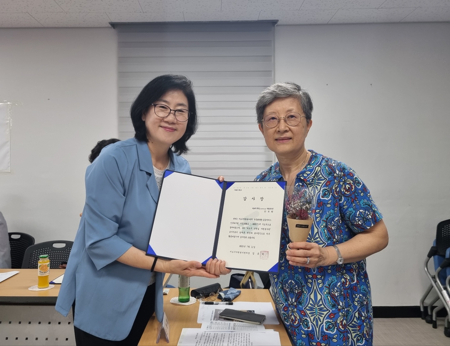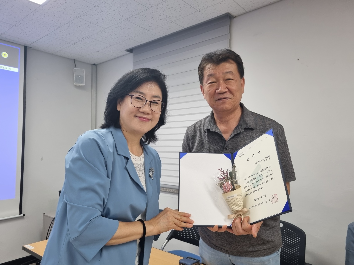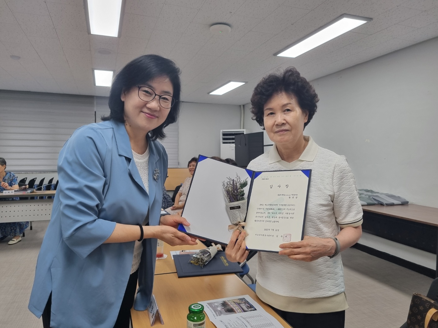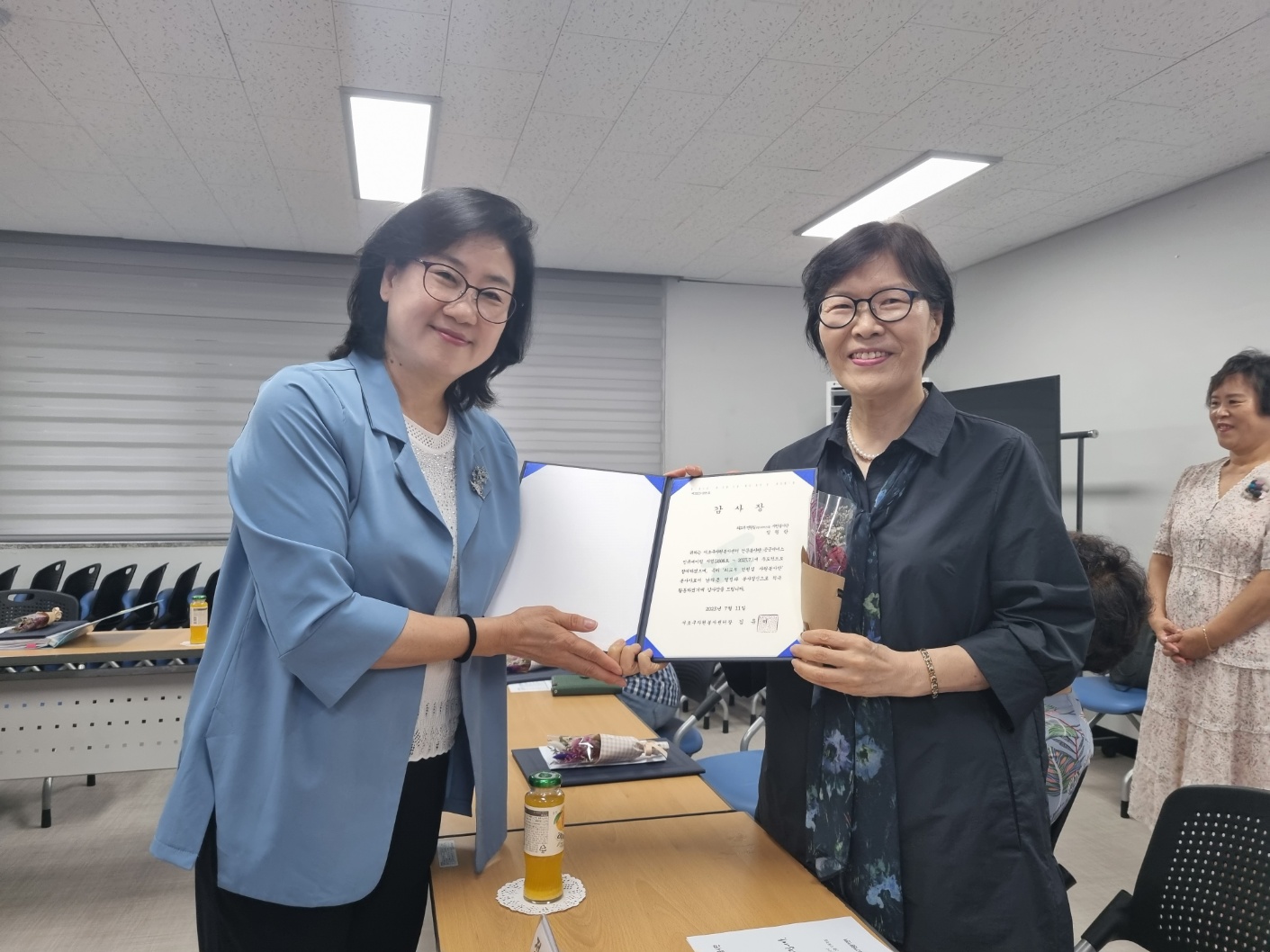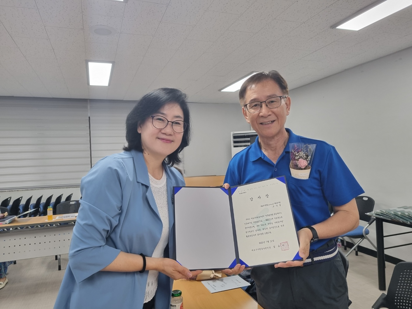 다음으로는 봉사자분들께 감사장을 수여하는 시간을 가졌습니다. 감사장과 꽃다발 수여는 김유미 센터장님이 맡아주셨고, 봉사자 분들과의 기념사진 촬영도 진행했습니다.