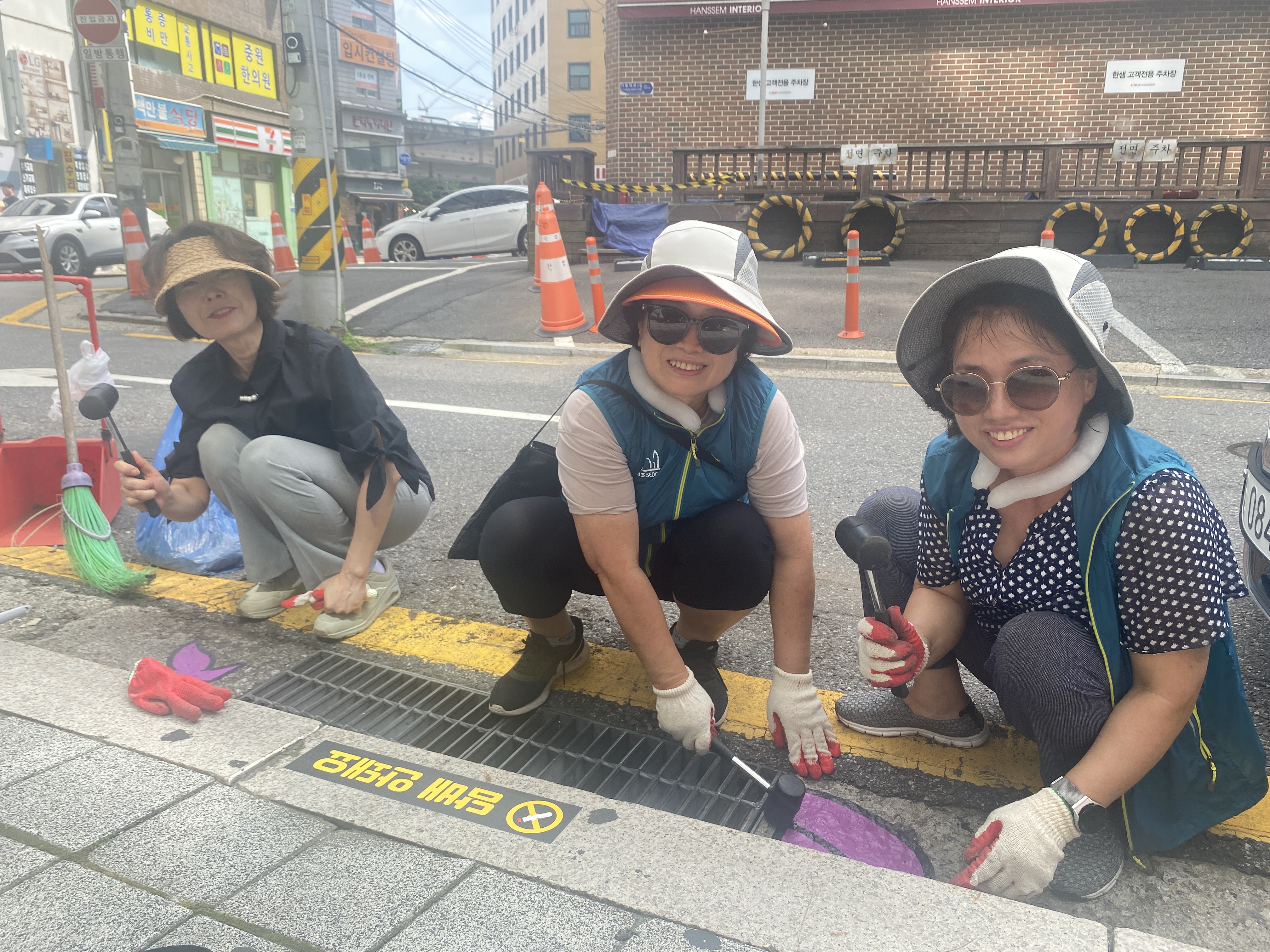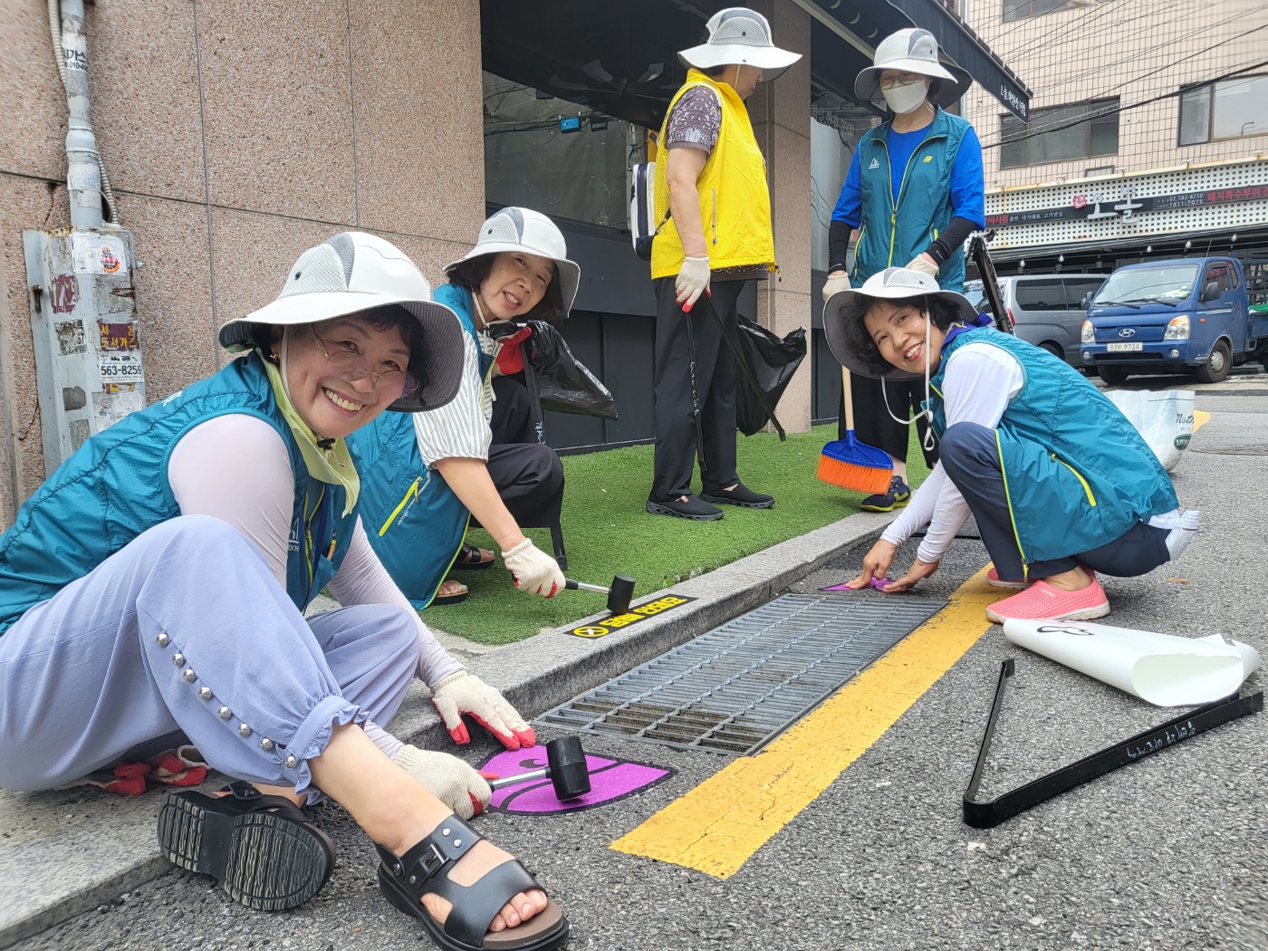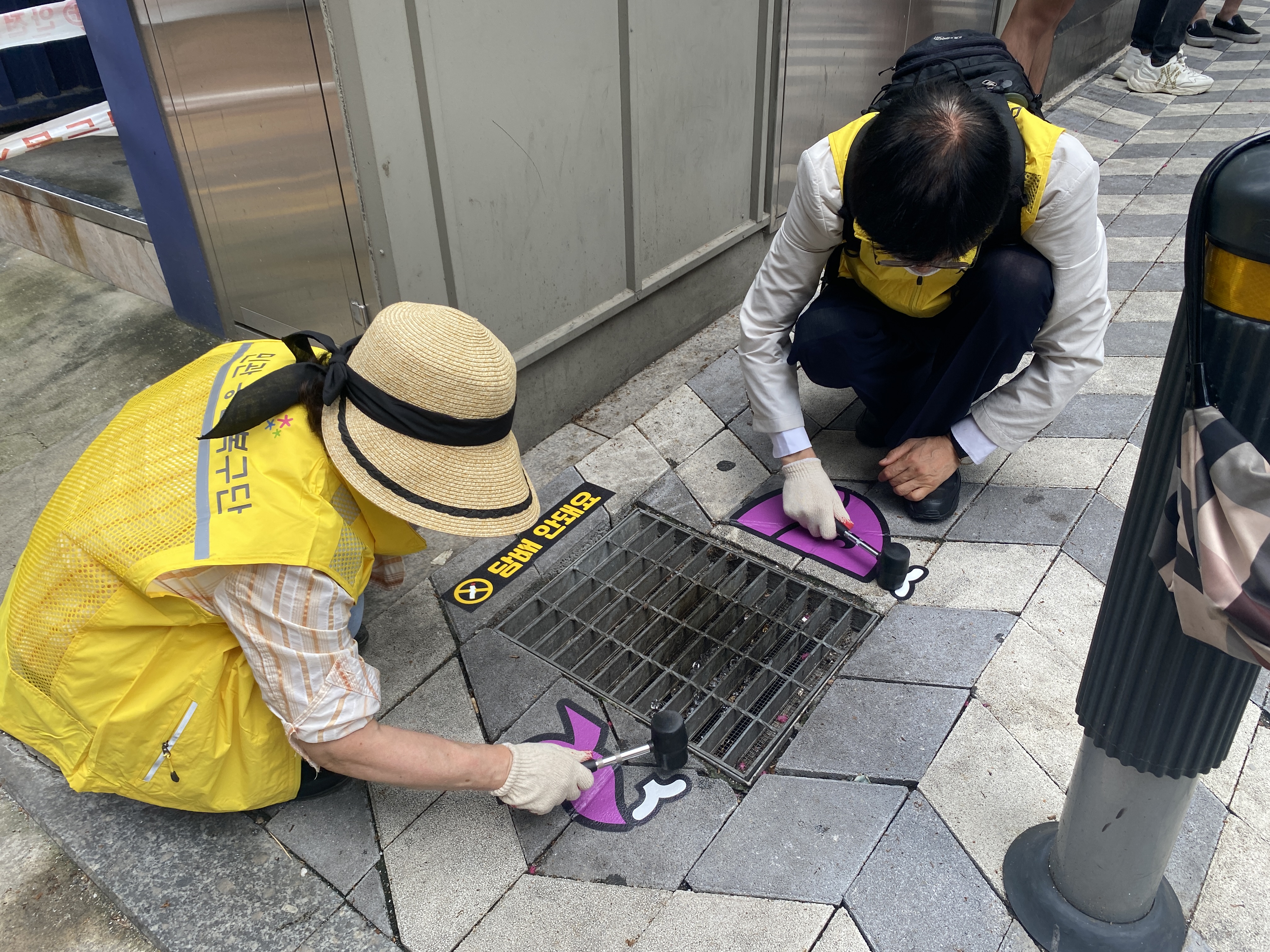 2023년 7~8월 장마철에 빗물받이 청소와 함께 쓰레기(담배꽁초) 무단투기 예방 스티커를 부착하는