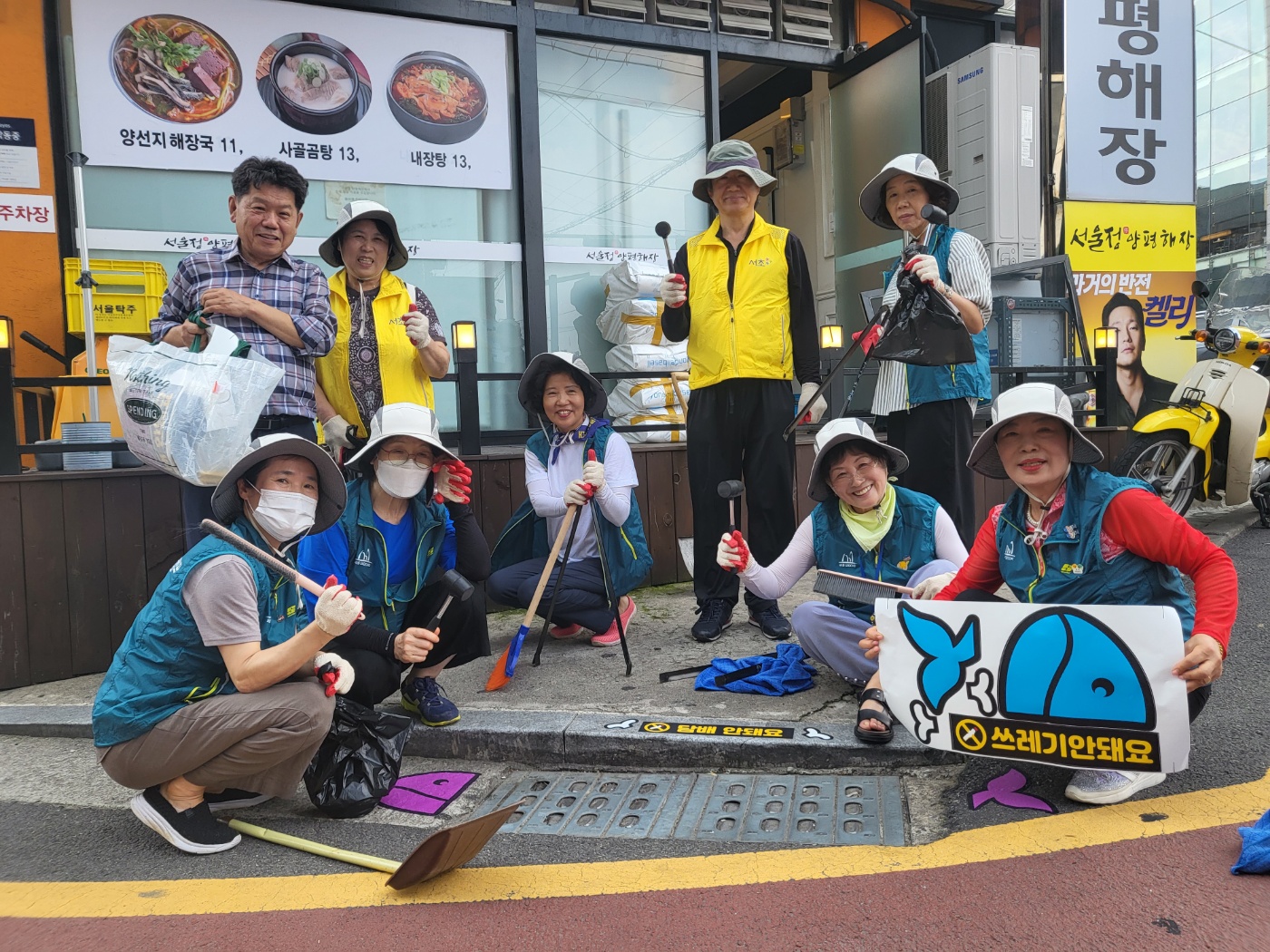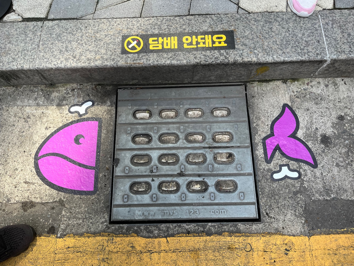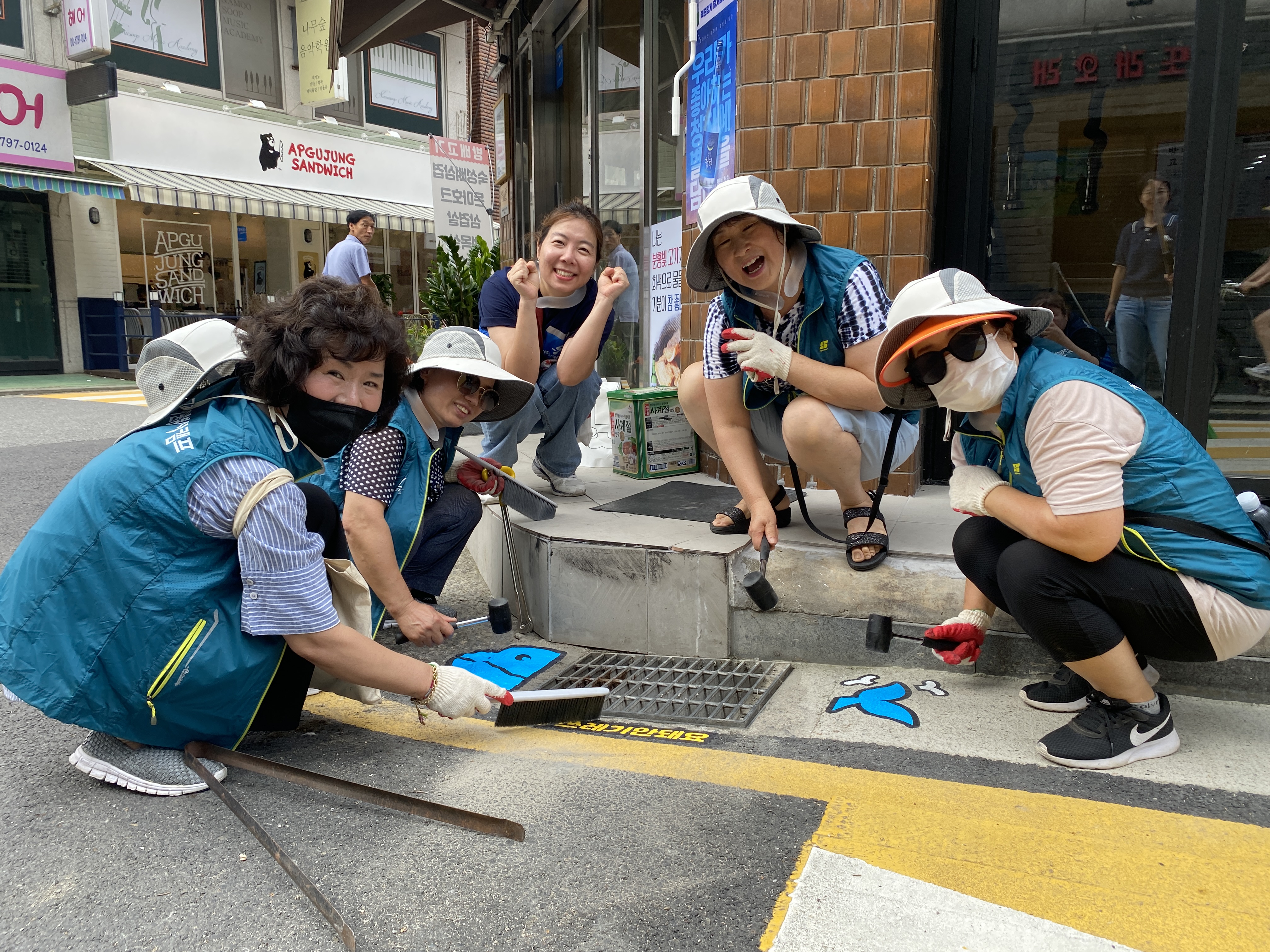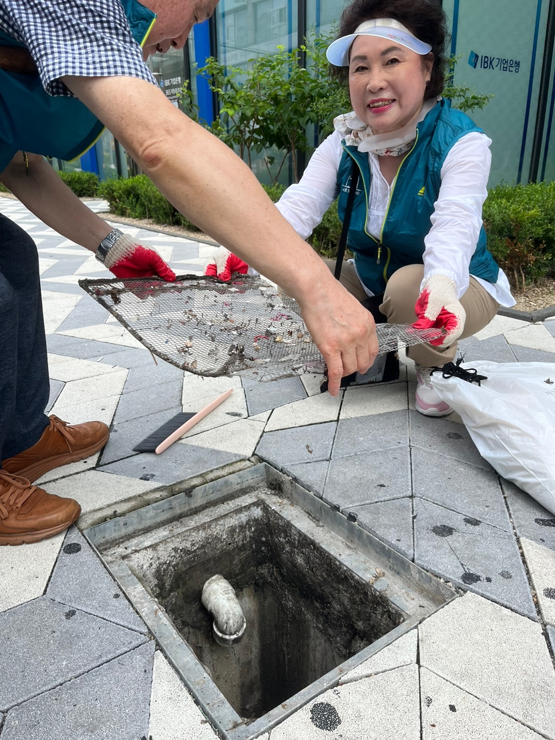 2023년 7~8월 장마철에 빗물받이 청소와 함께 쓰레기(담배꽁초) 무단투기 예방 스티커를 부착하는