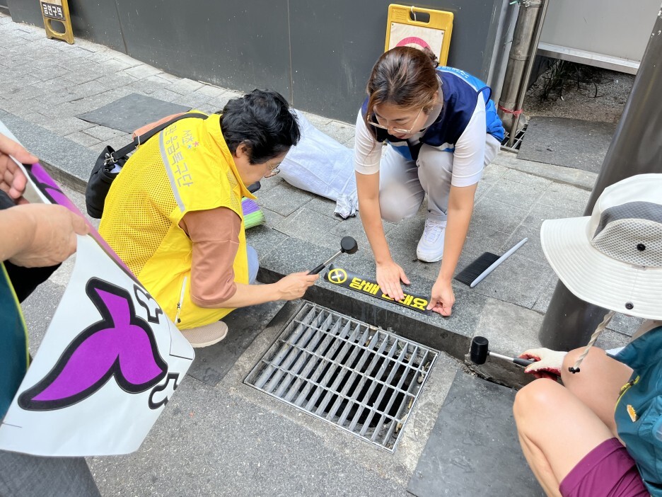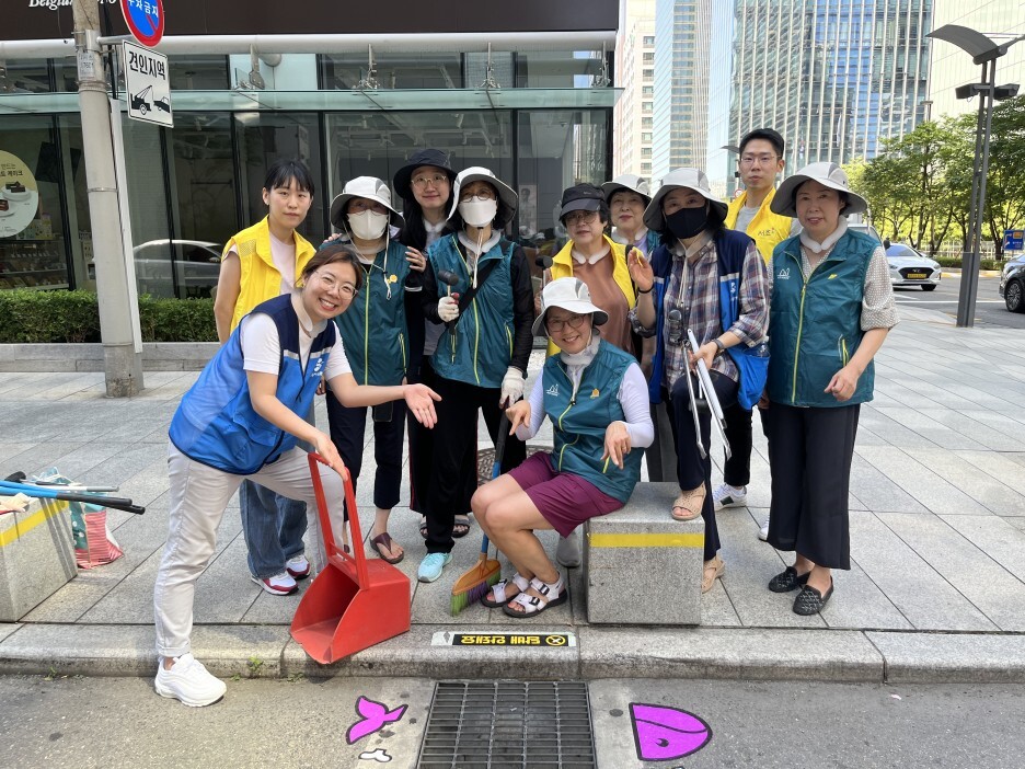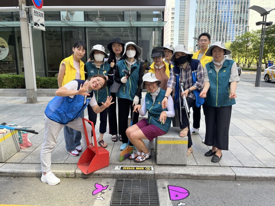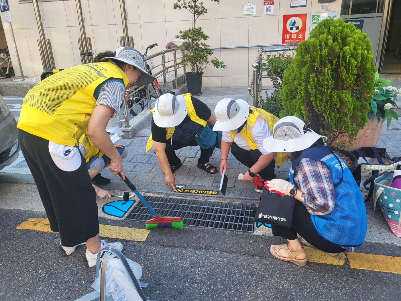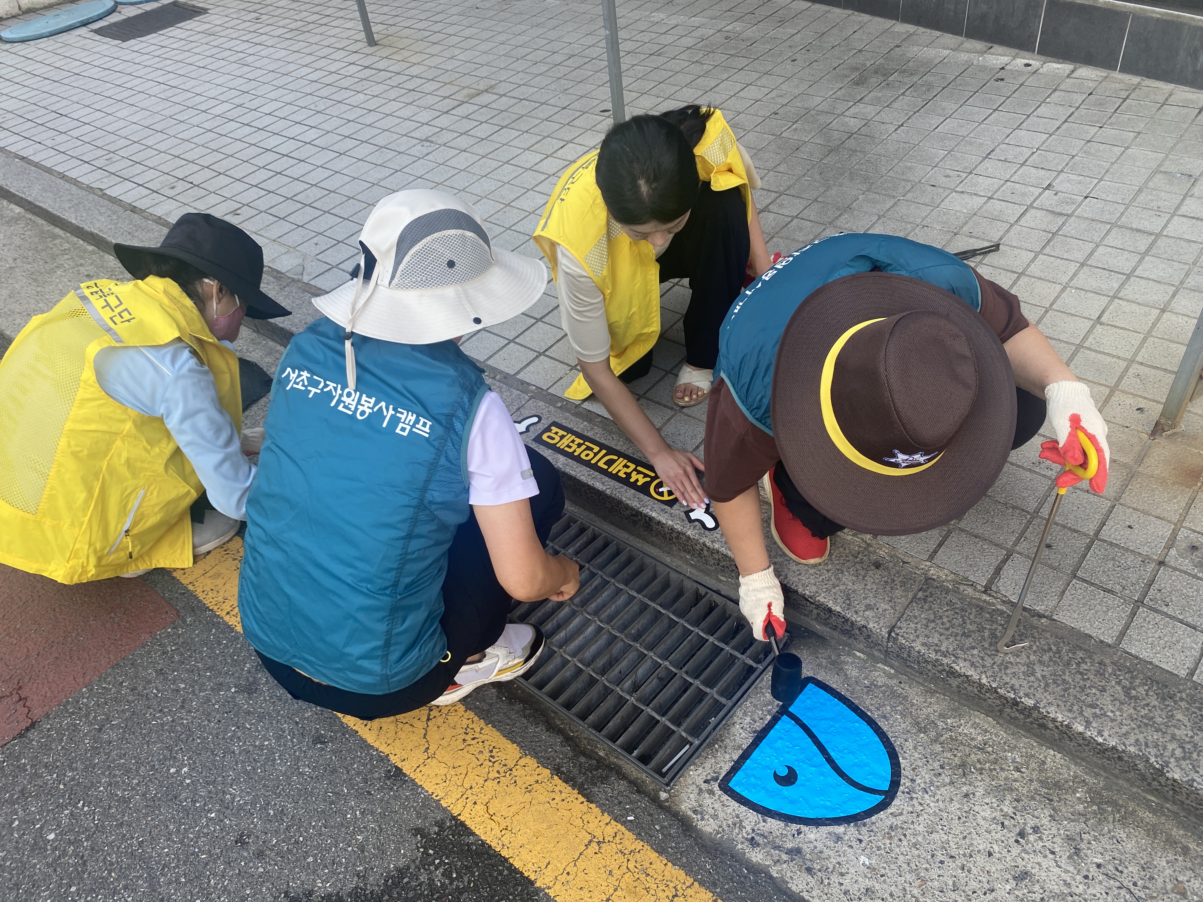 따라서 서초2동 자원봉사캠프에서는 이 빗물받이를 정화하고 담배꽁초를 버리지 말자는 스티커를 부착하는 캠페인을 기획했다고 합니다. 36도에 육박하는 매우 무더운 날씨였음에도 불구하고, 캠페인에 참여하기 위해 캠프장님을 비롯한 많은 자원봉사자분들께서 나와주셨습니다.