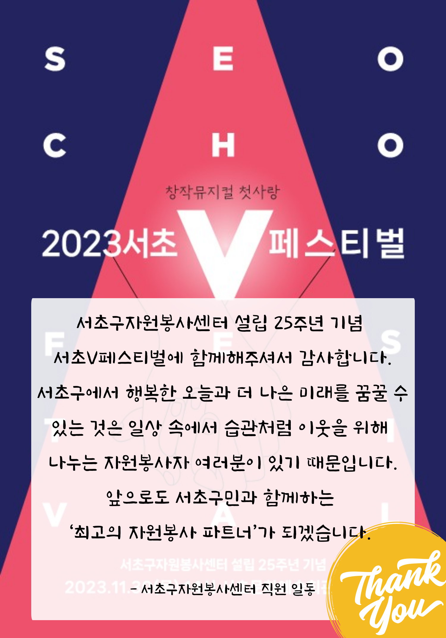 | 2023 서초V페스티벌 '봉사활동 시간에 따른 수상자' 명단 공고 (0) | 2023.11.08 |