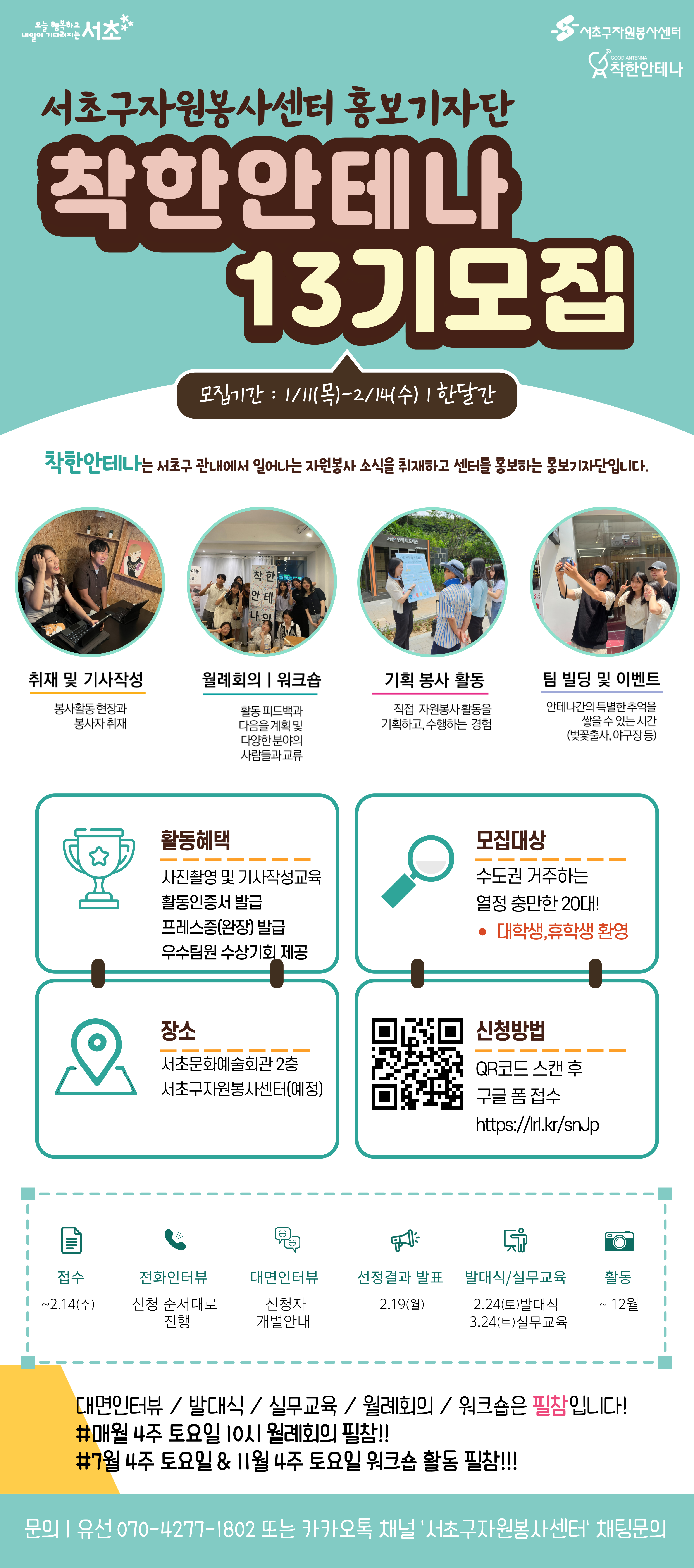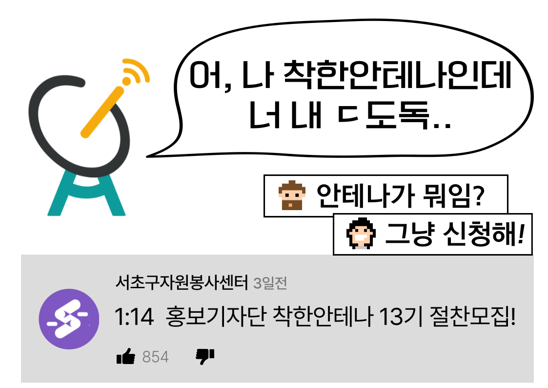 착한안테나는 2012년부터 운영되고 있는 서초구자원봉사센터 홍보기자단입니다. 본 활동은 1년 동안 참여하는 봉사활동이며, 기사 및 영상 등 콘텐츠를 기획하고 만드는 모든 과정이 봉사활동