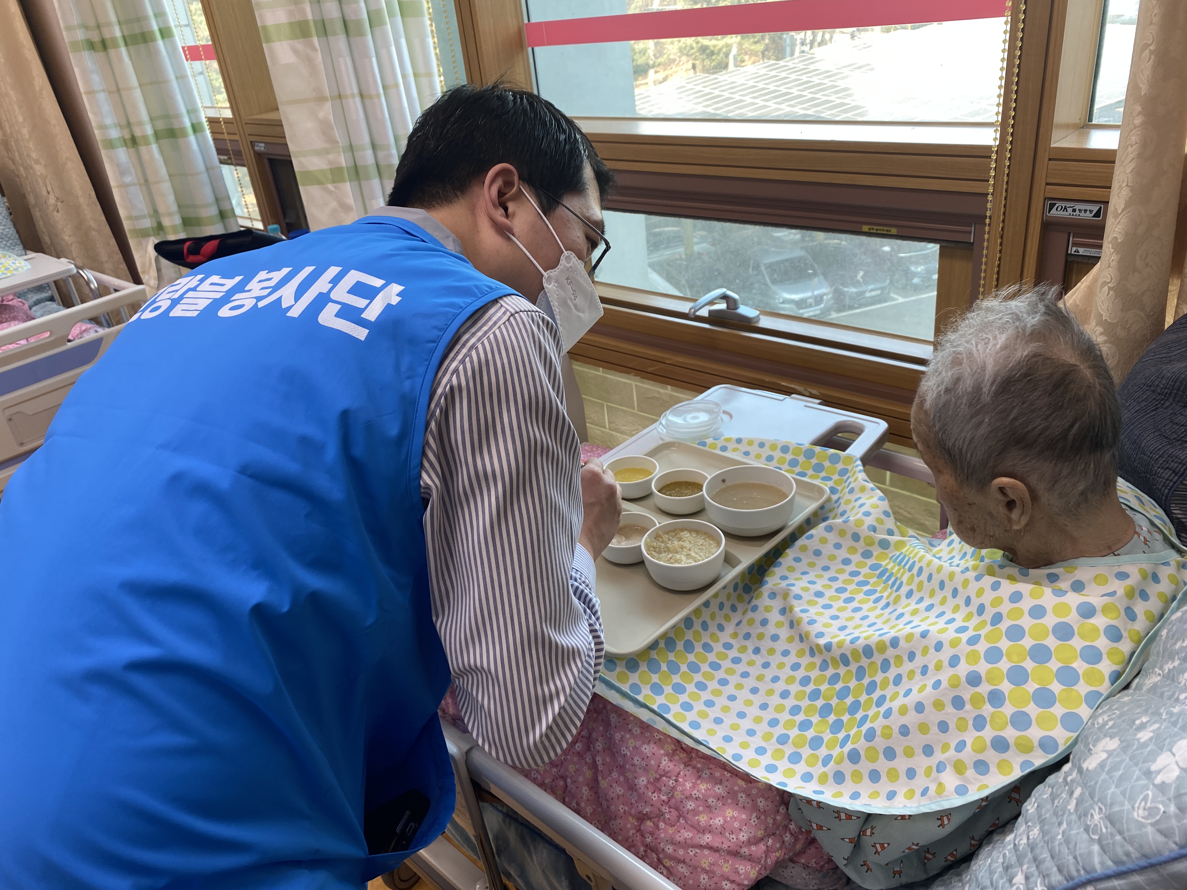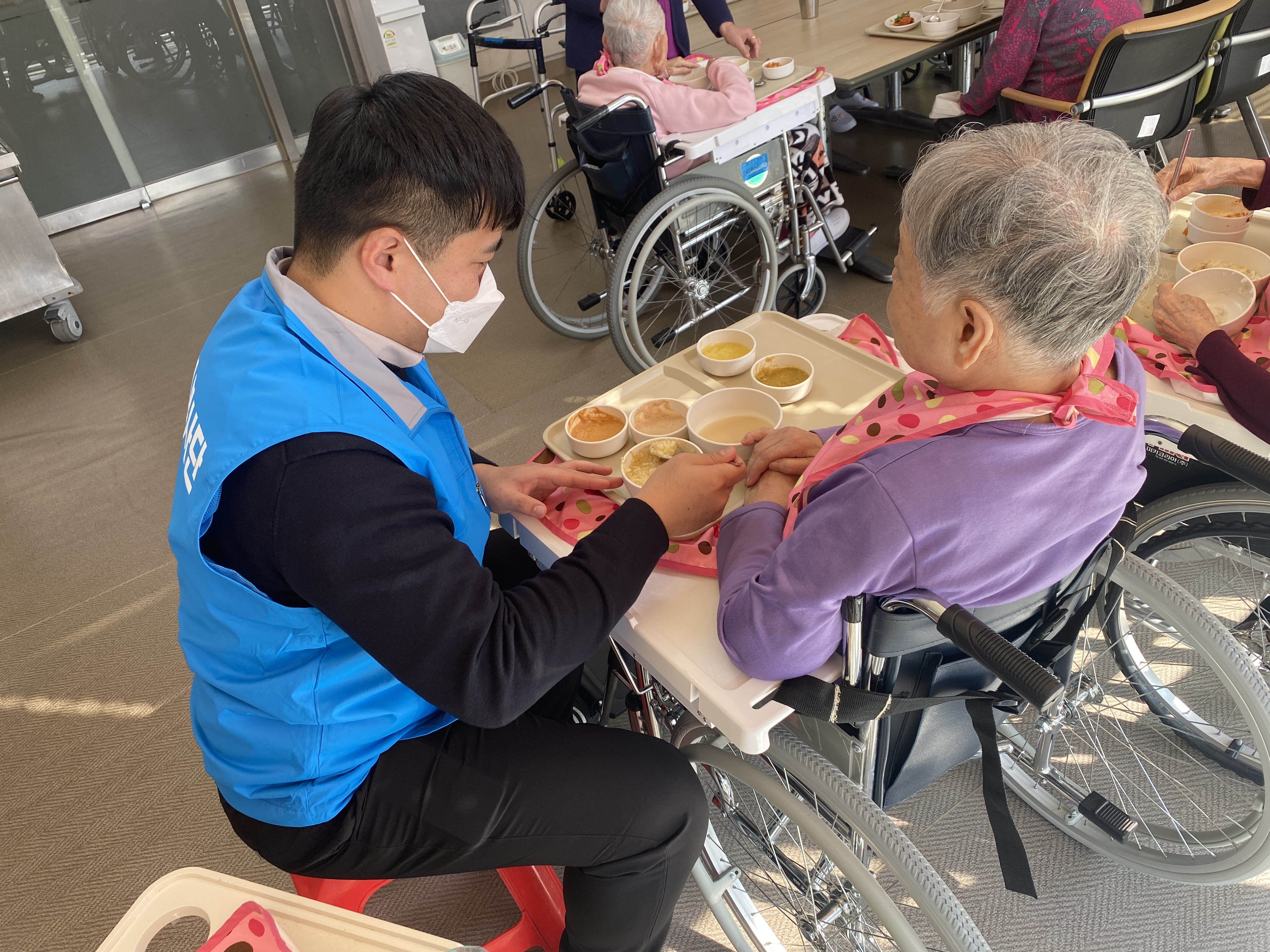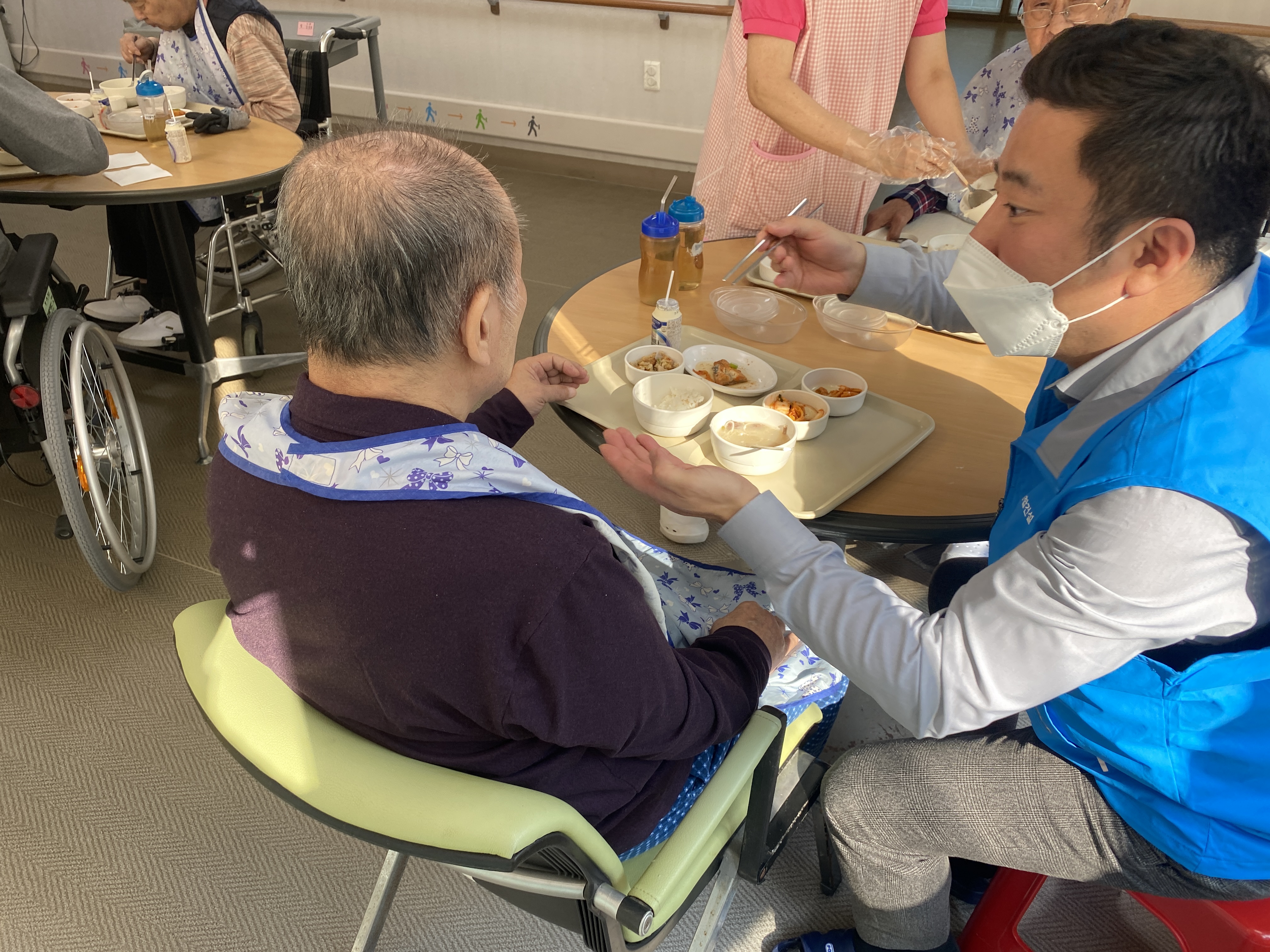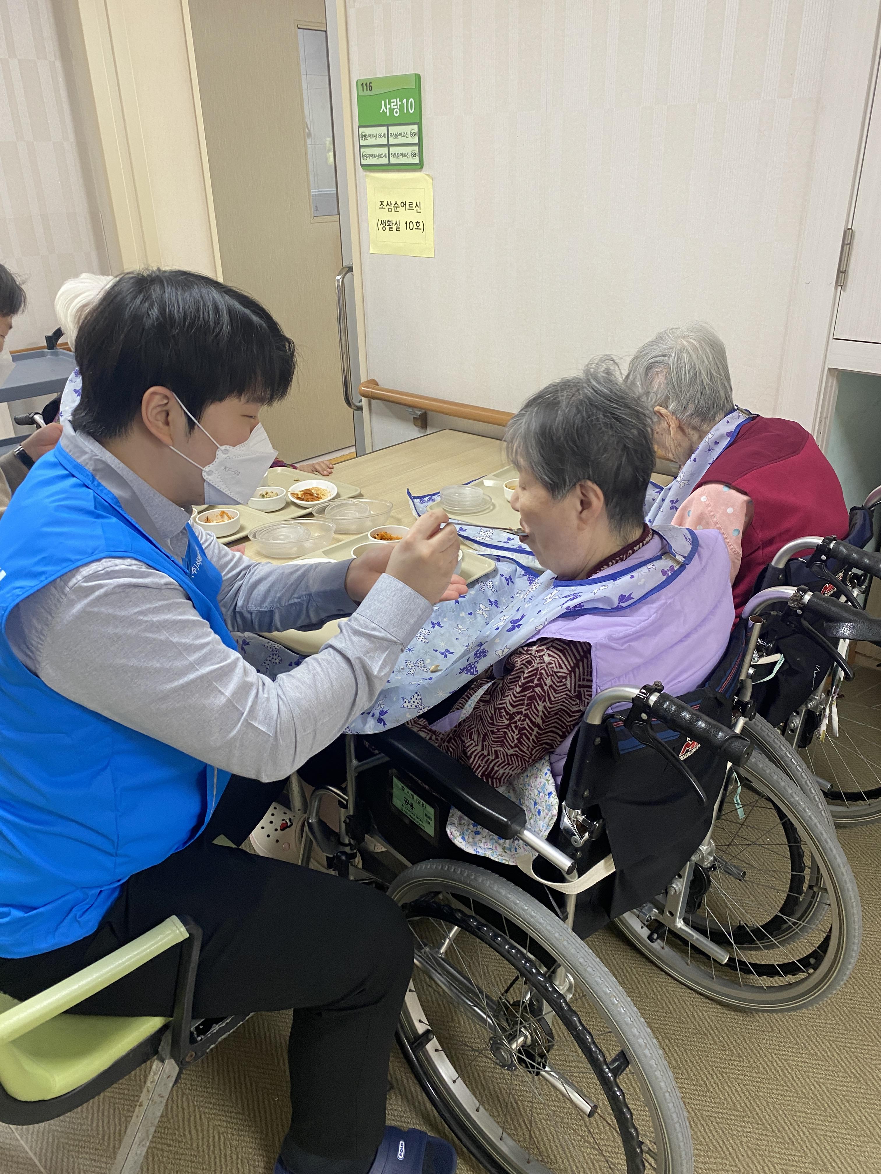 식사시간이 되어 거동이 불편한 어르신을 위해 맛있게 식사를 드실 수 있도록 옆에서 정성껏 식사보조를 진행했습니다.