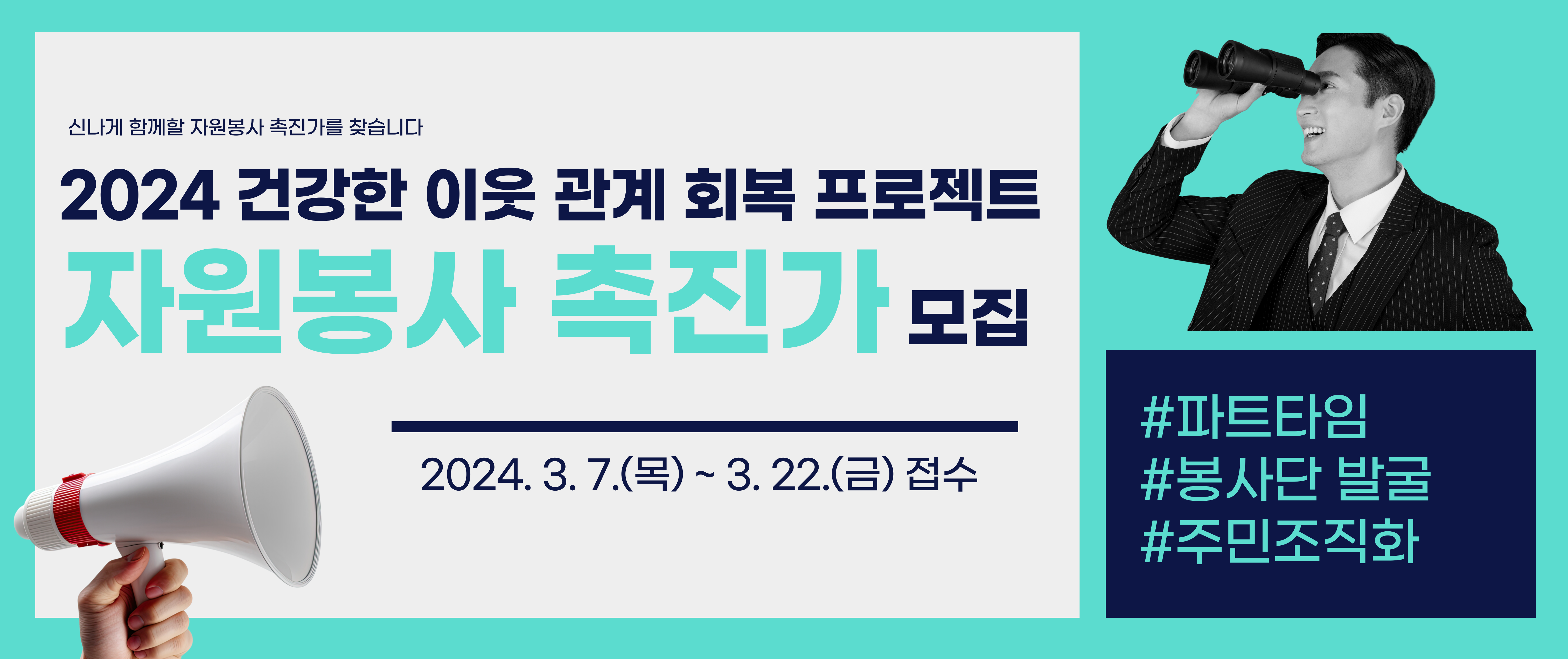 서초구자원봉사센터에서는 자원봉사활동이 매개가 되어 이웃 간 신뢰를 회복하고 건강한 공동체를 만들기 위해 2024년 건강한 이웃 관계 회복 프로젝트를 함께 추진할 활동가를 아래와 같이 모집합니다.
