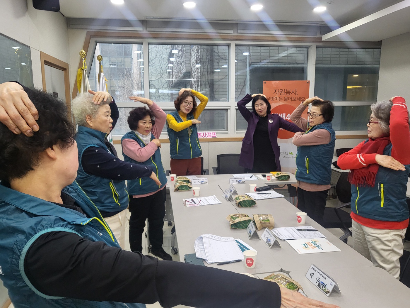 건강한 자원봉사를 위해 체조도 하며 화기애애한 회의가 이어집니다.