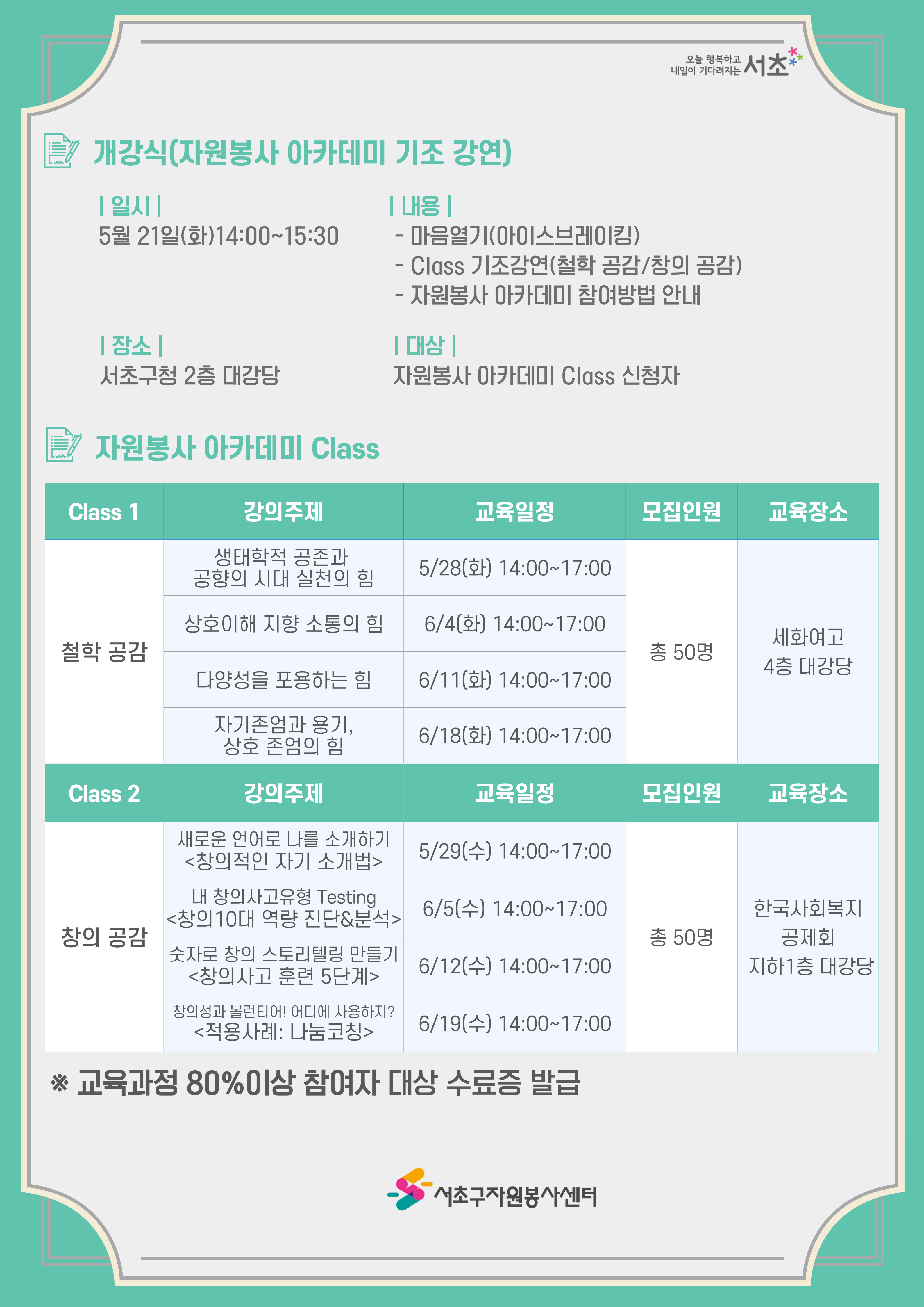서초구자원봉사센터는 자원봉사 현장의 깊이를 더하고 자원봉사자의 성장과 품격을 높이는 클래스