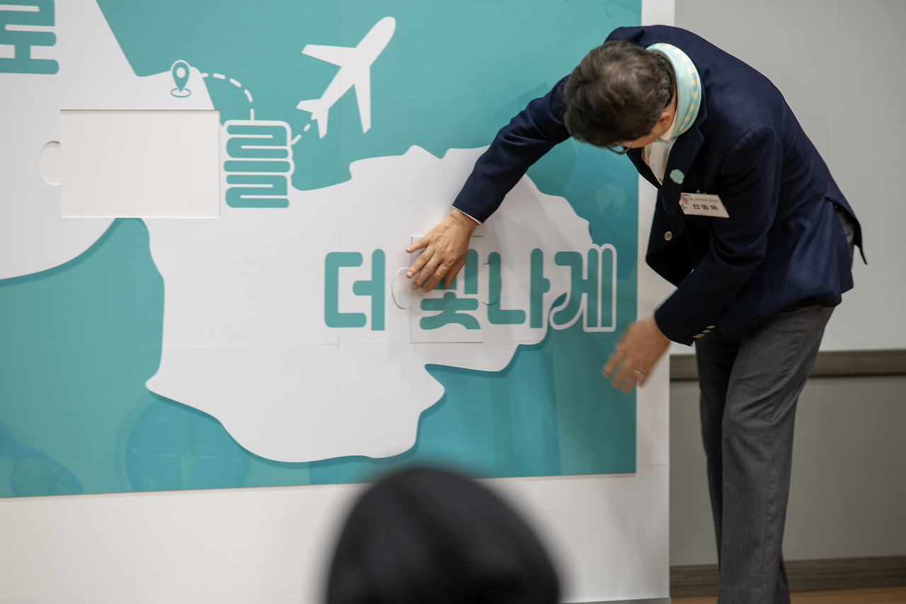 오늘 행사의 가장 하이라이트인 새출발 다짐 세레머니입니다. 신규 봉사자 세 분과 신규 역할을 맡으신 기존 봉사자 두 분, 신동욱 서초을 국회의원 당선인님과 오세철 서초구의장님, 전성수 서초구청장님, 유종균 서초구자원봉사센터 운영위원장님, 김유미 서초구자원봉사센터 센터장님이 연단에 올라 각자 가지고 있는 퍼즐판을 부착하는 시간이었습니다.