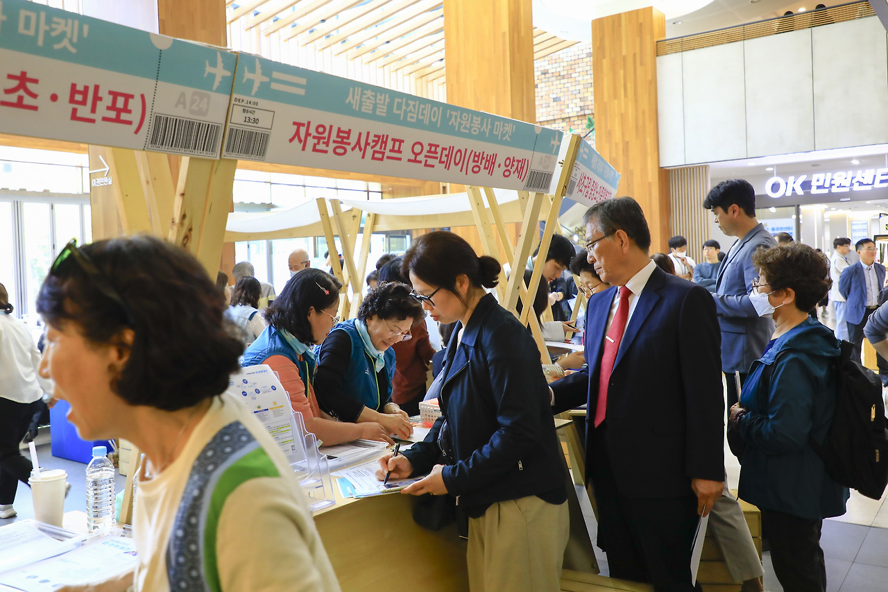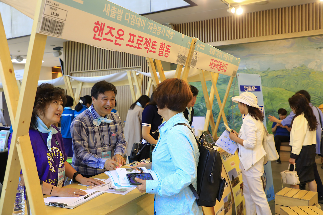 여행을 갈 때 맨 처음 어디를 들리시나요? 대부분 면세점 등의 쇼핑 코너를 들리게 됩니다. 새출발 다짐데이도 새로운 자원봉사를 출발하기 전에 쇼핑을 하는 느낌으로 자원봉사 마켓이라는 활동 신청 부스를 운영하였습니다. 자원봉사 마켓에서는 ▲1365 포털 안내 ▲자원봉사 캠프 4개 권역 오픈데이 ▲프로젝트리더 봉사단과 함께 하는 활동 ▲수해예방 모래주머니 만들기 ▲아름다운가게 서초점 매장운영 ▲서초구립 중앙노인종합복지관 배식 및 뒷정리 ▲새빛바울의집 산책보행나들이의 봉사활동 신청 부스가 참여자들을 맞이했습니다.