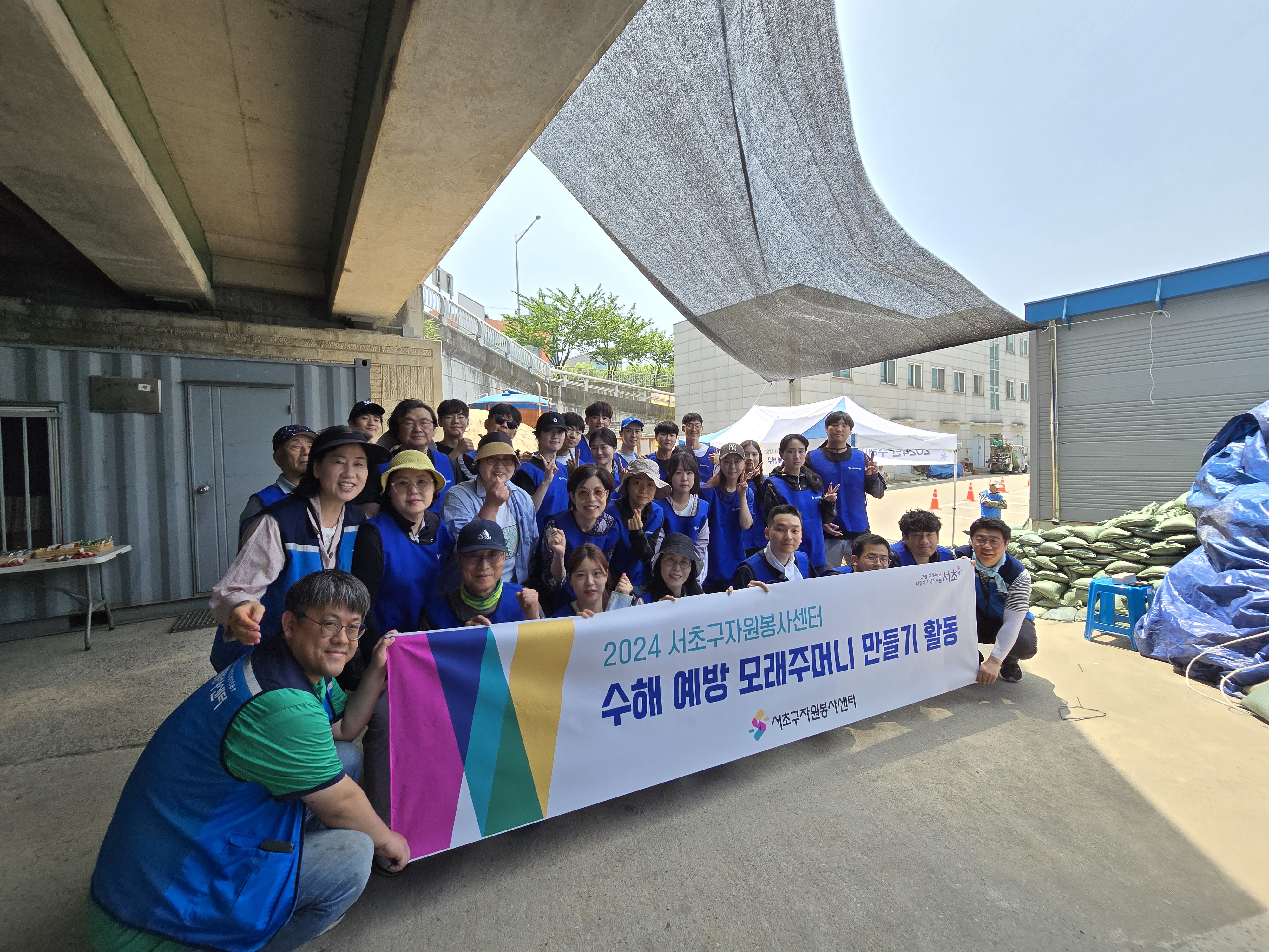 서초구자원봉사센터에서는 지난 5월 2일(목)에 진행한 새출발 다짐데이 활동 부스에 신청한 새내기 자원봉사자 12명과 함께 수해예방 모래주머니 만들기 활동을 진행하였습니다.