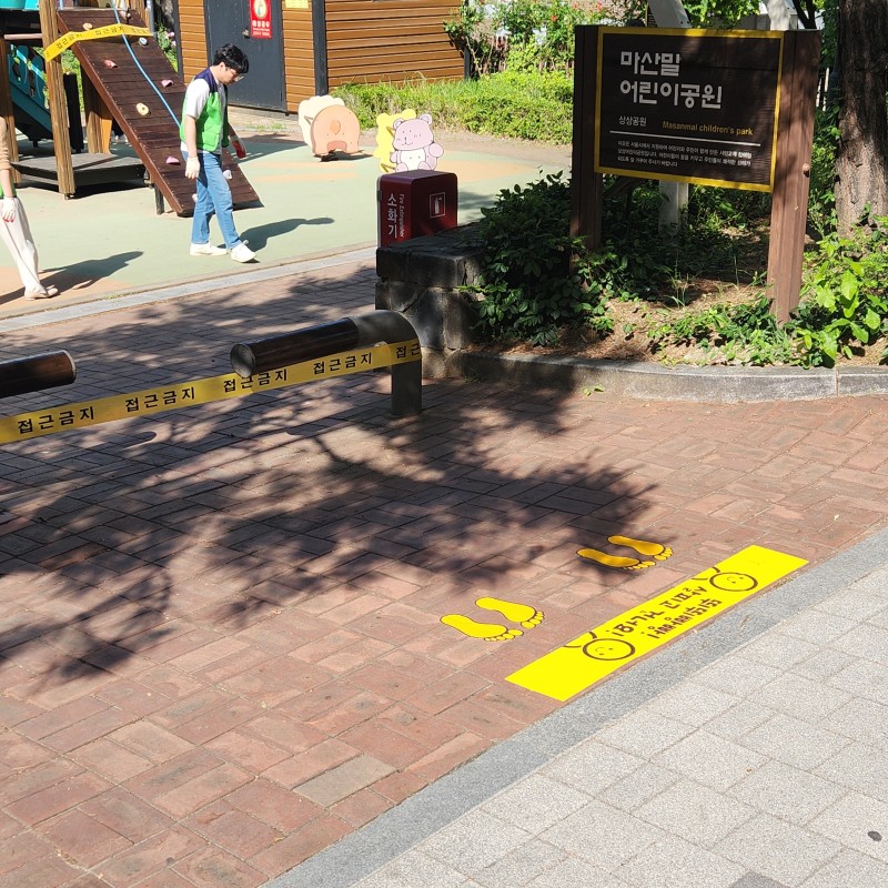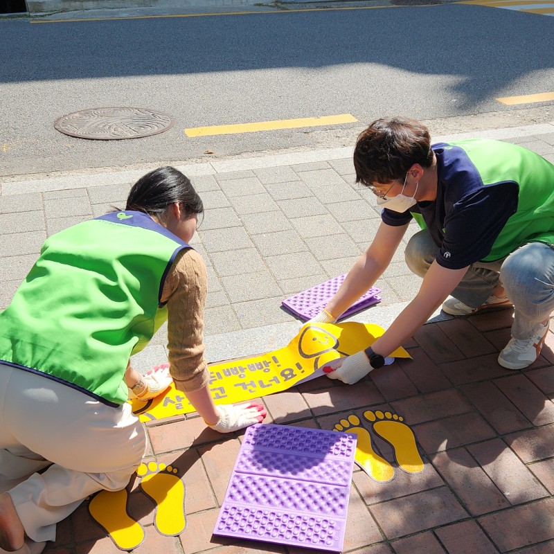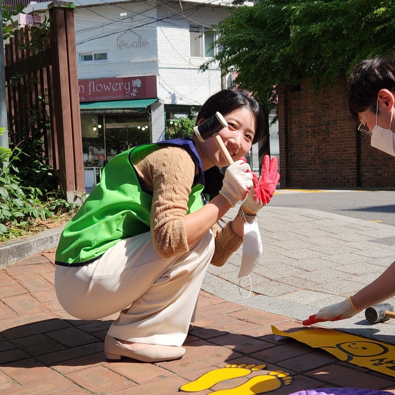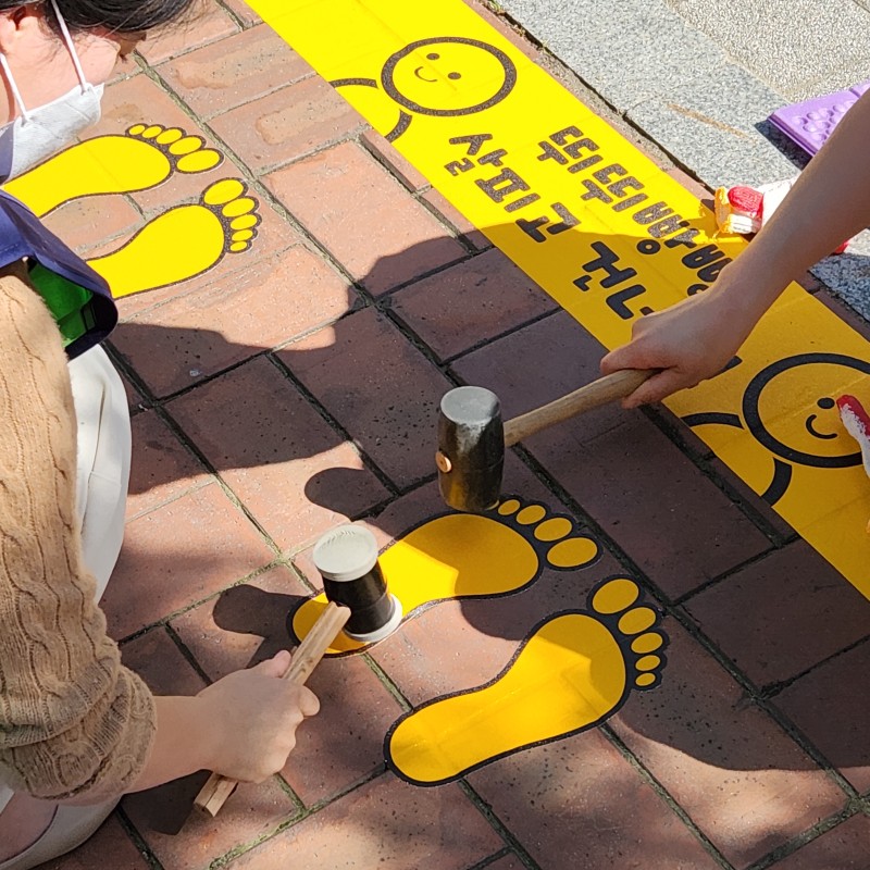 활동이 진행된 공원은 어린이들이 많이 사용하는 장소였지만, 주위가 차도로 둘러쌓여있고 많은 차들이 지나다녔습니다. 그래서 안전사고 예방을 위해 공원의 입구에 안전횡단 표식을 부착하였습니다. 이 팀은 우선 바닥에 이물질을 깨끗하게 청소하고, 알맞은 위치에 눈에 잘 띄는 노란색 발바닥과 안내문 스티커를 배치한 후 고무망치로 열심히 두드렸습니다.