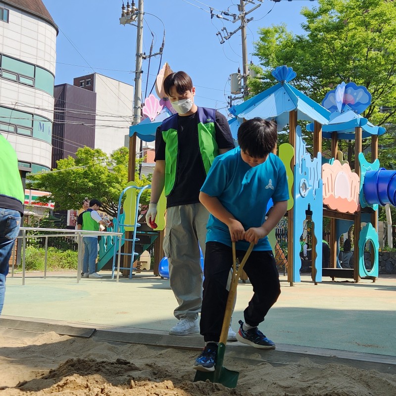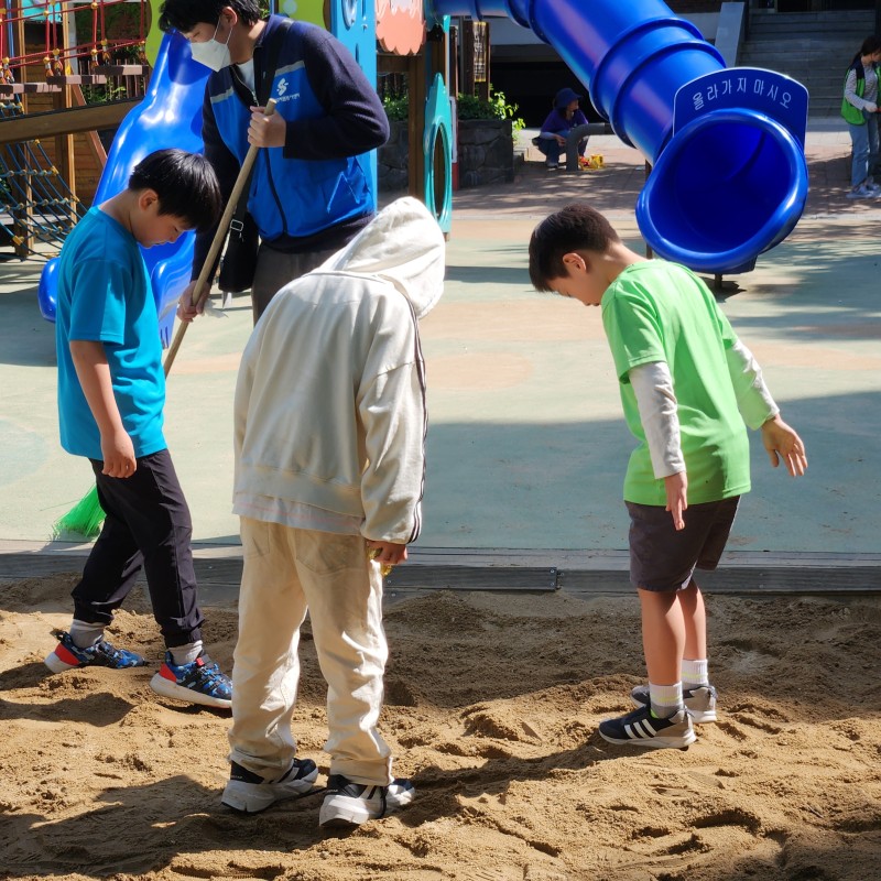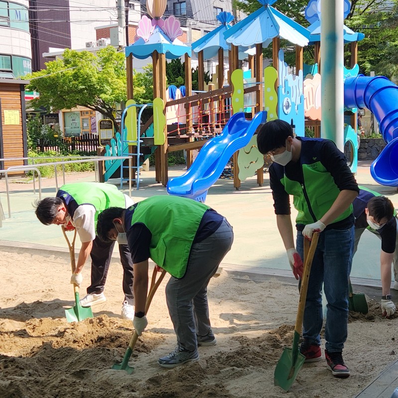 공원의 한 쪽에는 아이들이 많이 사용하는 모래사장이 있었습니다. 아이들의 더 안전하고 위생적인 모래사장 사용을 위해 봉사자분들은 직접 모래를 삽으로 뒤섞고, 큰 돌과 이물질을 골라내는 작업을 하였습니다.