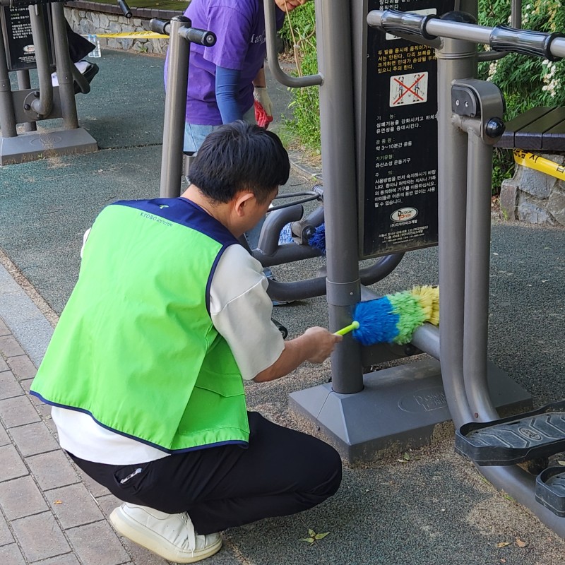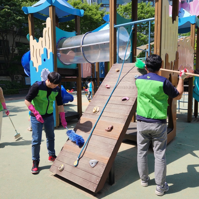 공원 벤치 및 놀이기구 보수팀은 우선 오랜기간 청소하지 않아 많은 흙먼지들로 오염된 벤치와 놀이기구를