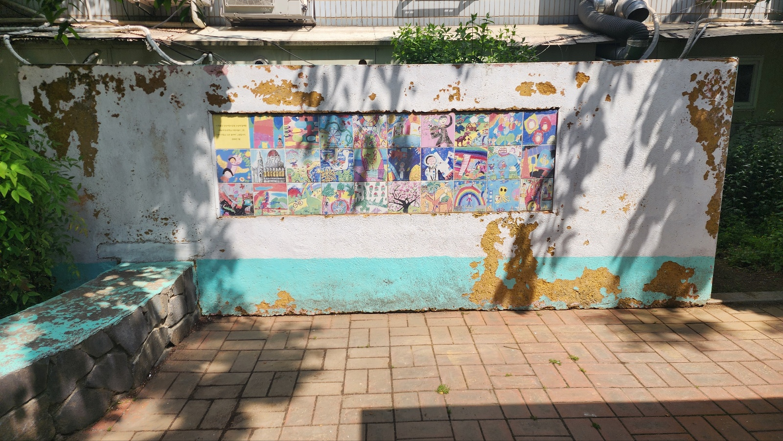 벽화활동팀은 공원내 벽화에 먼지를 털어내고 하얀색과 파란색 페인트를 칠하여