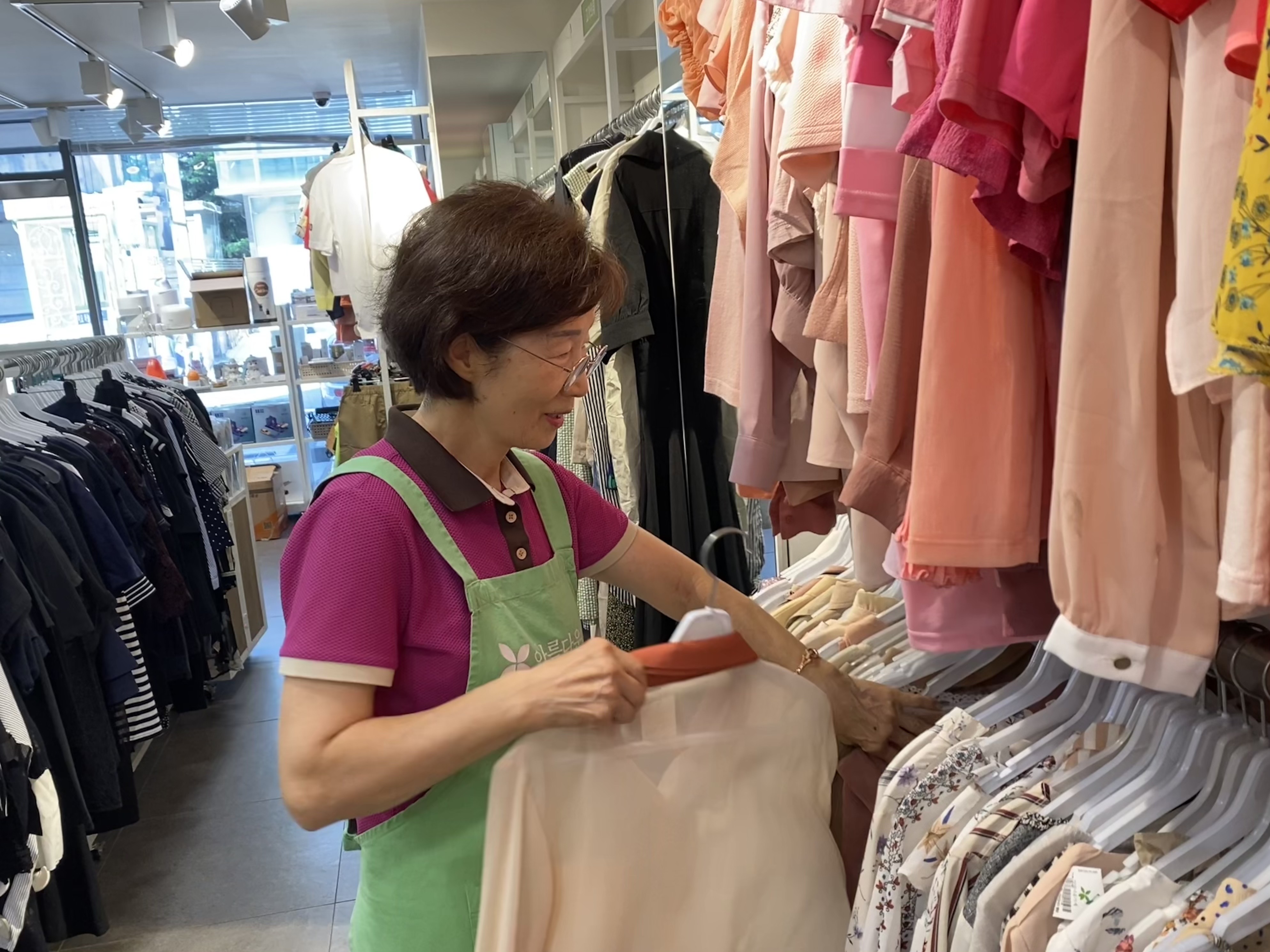 다양한 부스 중에 아름다운가게가 있었어요. 워낙 옷에 관심이 많기도 하고, 매니저(아름다운가게 서초점 자원봉사 관리자)님이 상냥하게 설명을 잘해주셨어요. 아름다운가게 서초점을 원래 알고는 있었지만, 물품을 기부하며 자원이 재순환되고 환경보호에도 기여한다는 게 '정말 좋은 일이구나.'라는 생각이 들어서 봉사활동을 결심하게 됐어요.
