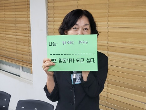 A. 저는 2번째로 참여하는 교육입니다. 많은 교류와 소통이 처음이라 어떻게 활동해야 하는지 잘 몰랐습니다. 이제 앞으로 자원봉사 현장에서 어떻게 활동하면 좋을지 배우고 싶습니다.