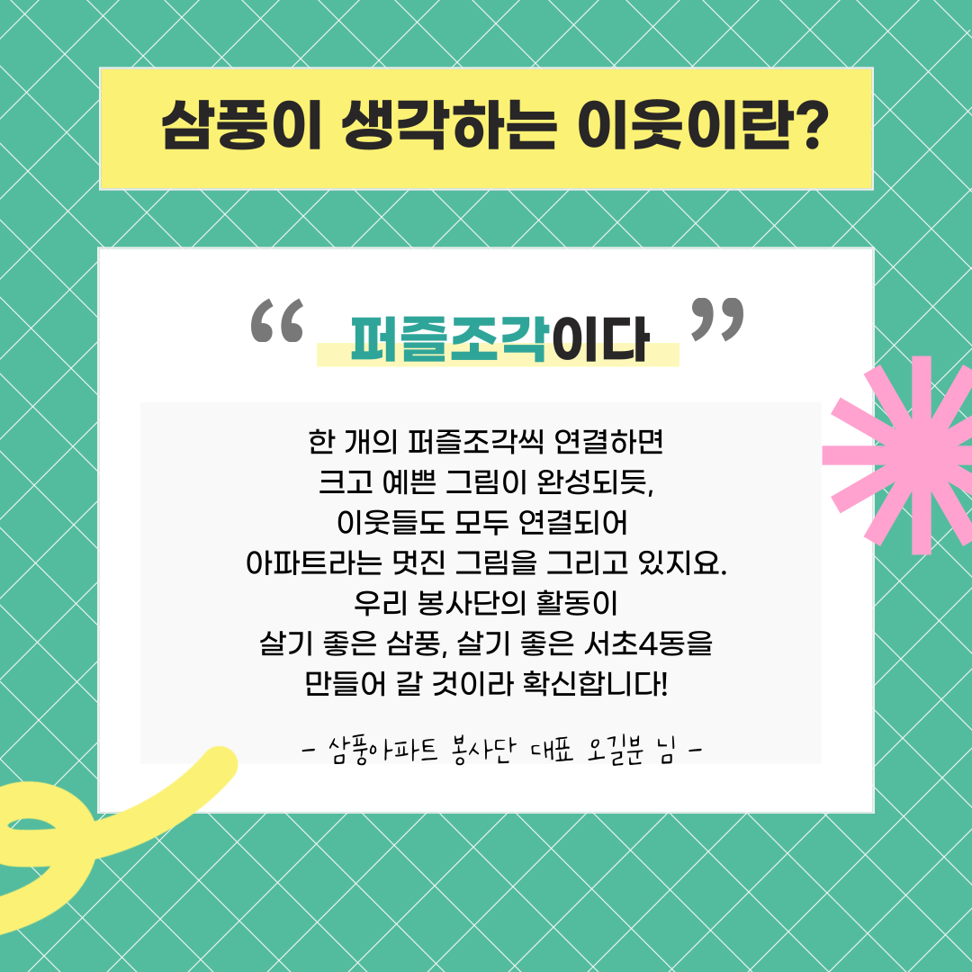 우리 봉사단의 활동이 살기 좋은 삼풍, 살기 좋은 서초4동을 만들어 갈 것이라 확신합니다!