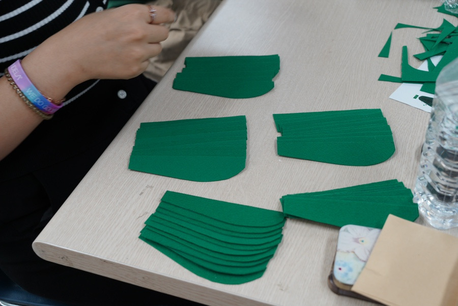 다음 순서로 잘라진 펠트지를 모양 틀에 올리고 차례대로 글루건을 묻혀 붙여주었습니다!