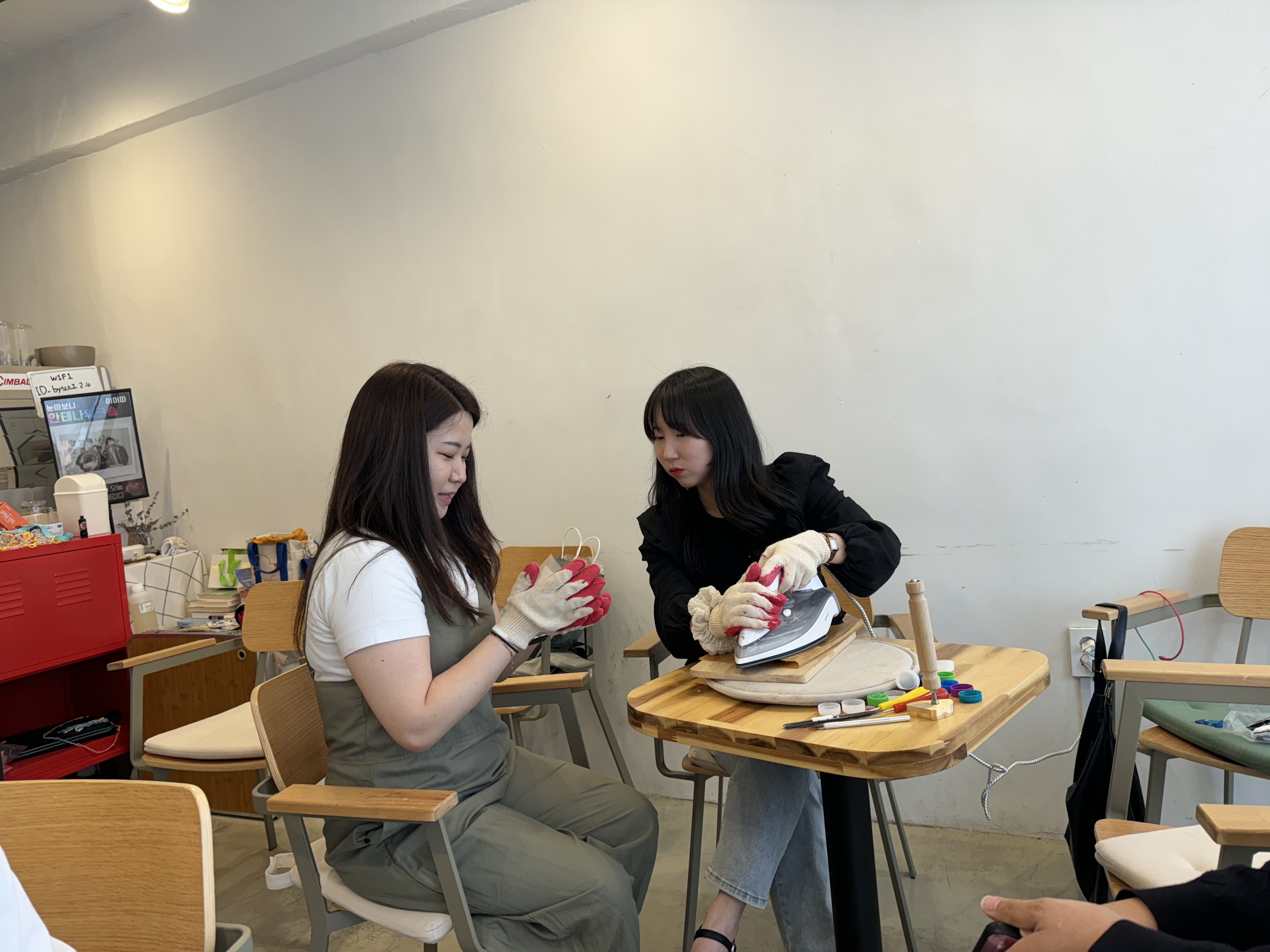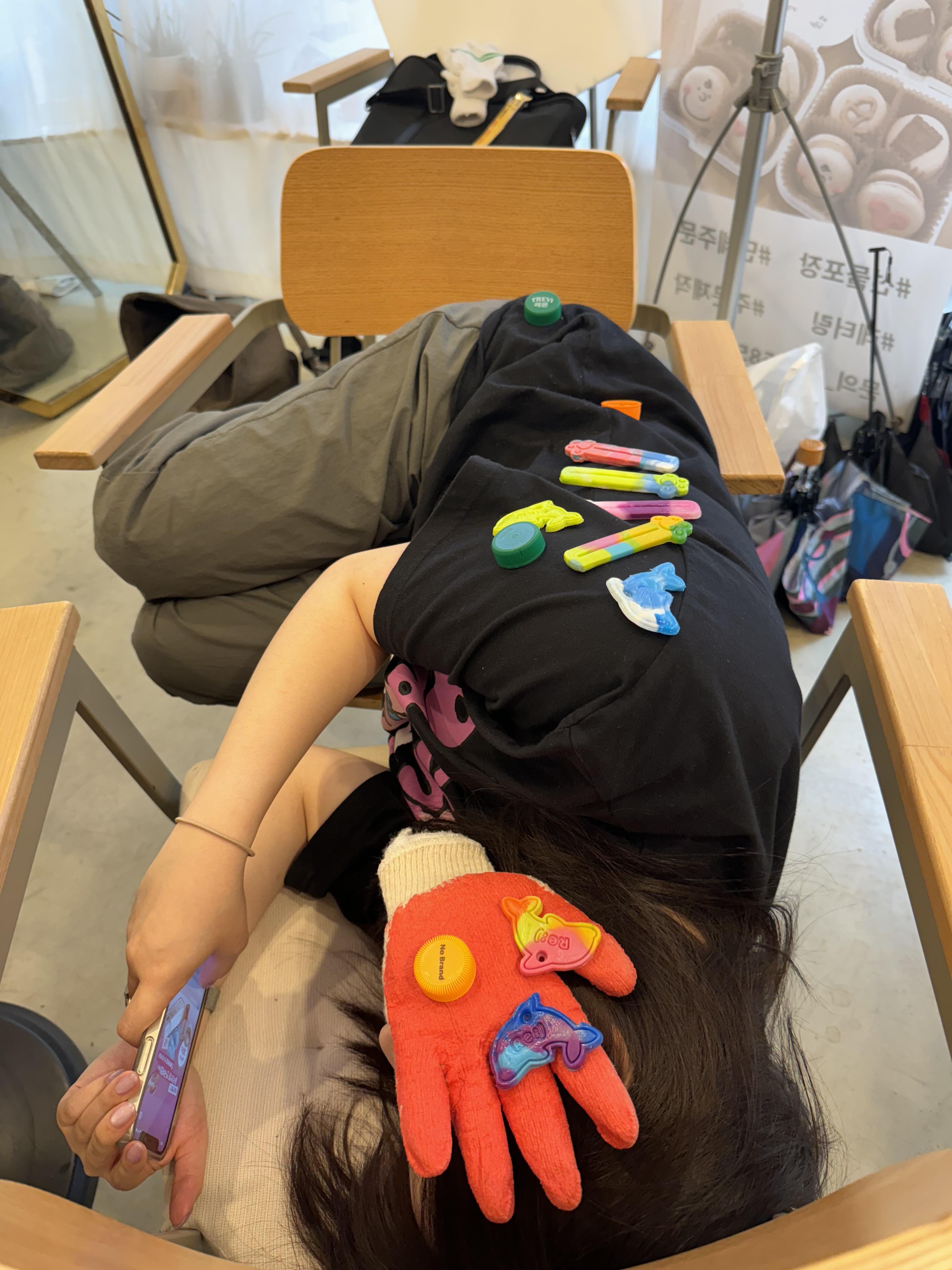 착테나가 열심히 만들어놓은 병뚜껑 키링을 고르고, 현장에서 슈링클지에 그림을 그려