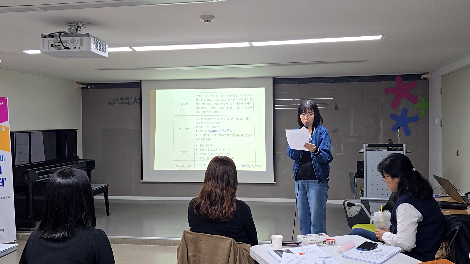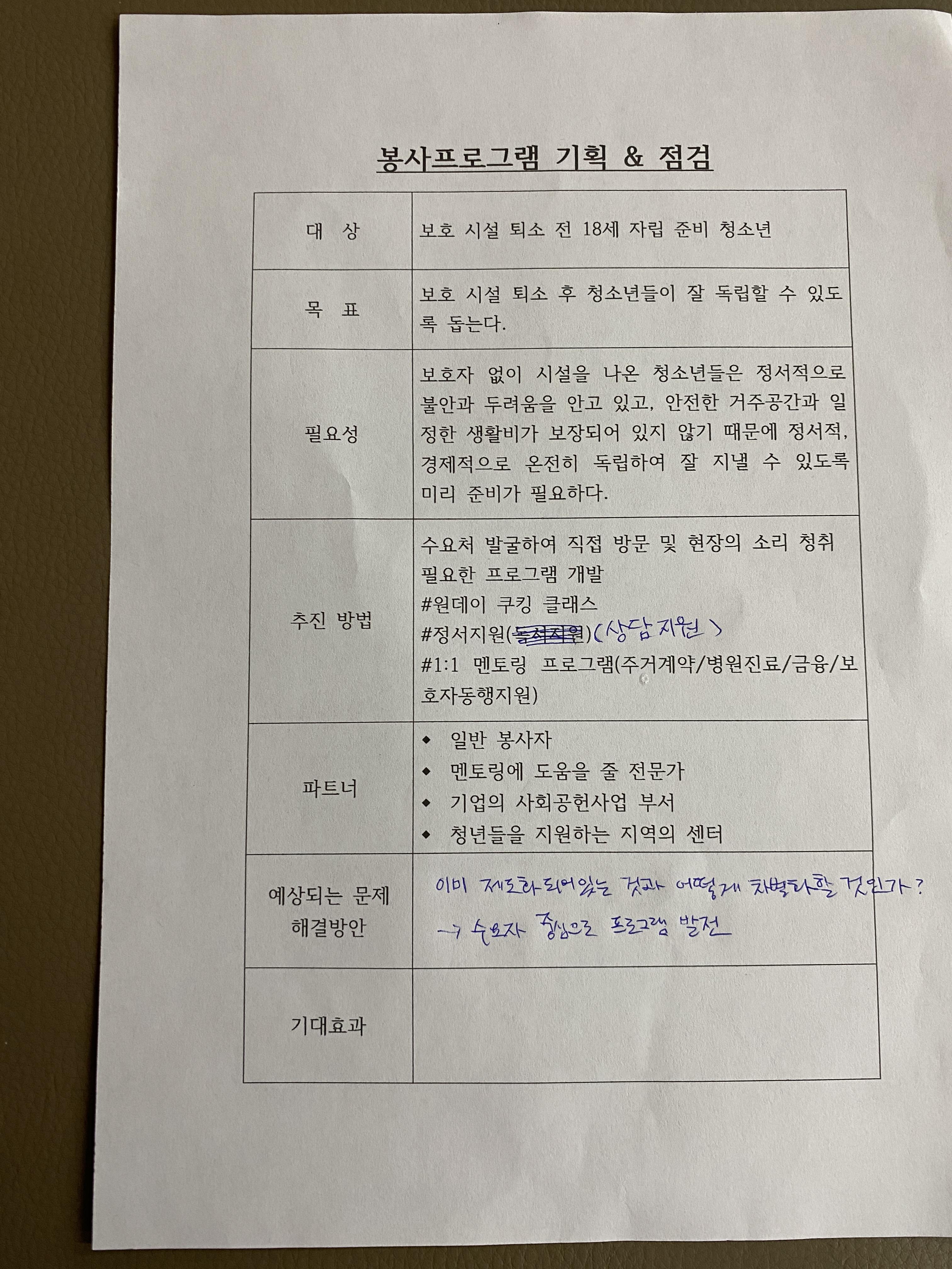 '대상'. '목표', '필요성', '추진 방법', '파트너', '예상되는 문제' 등에 대한 내용을 담아 실현가능한 목표와 방안을 발표하는 시간을 가졌습니다.