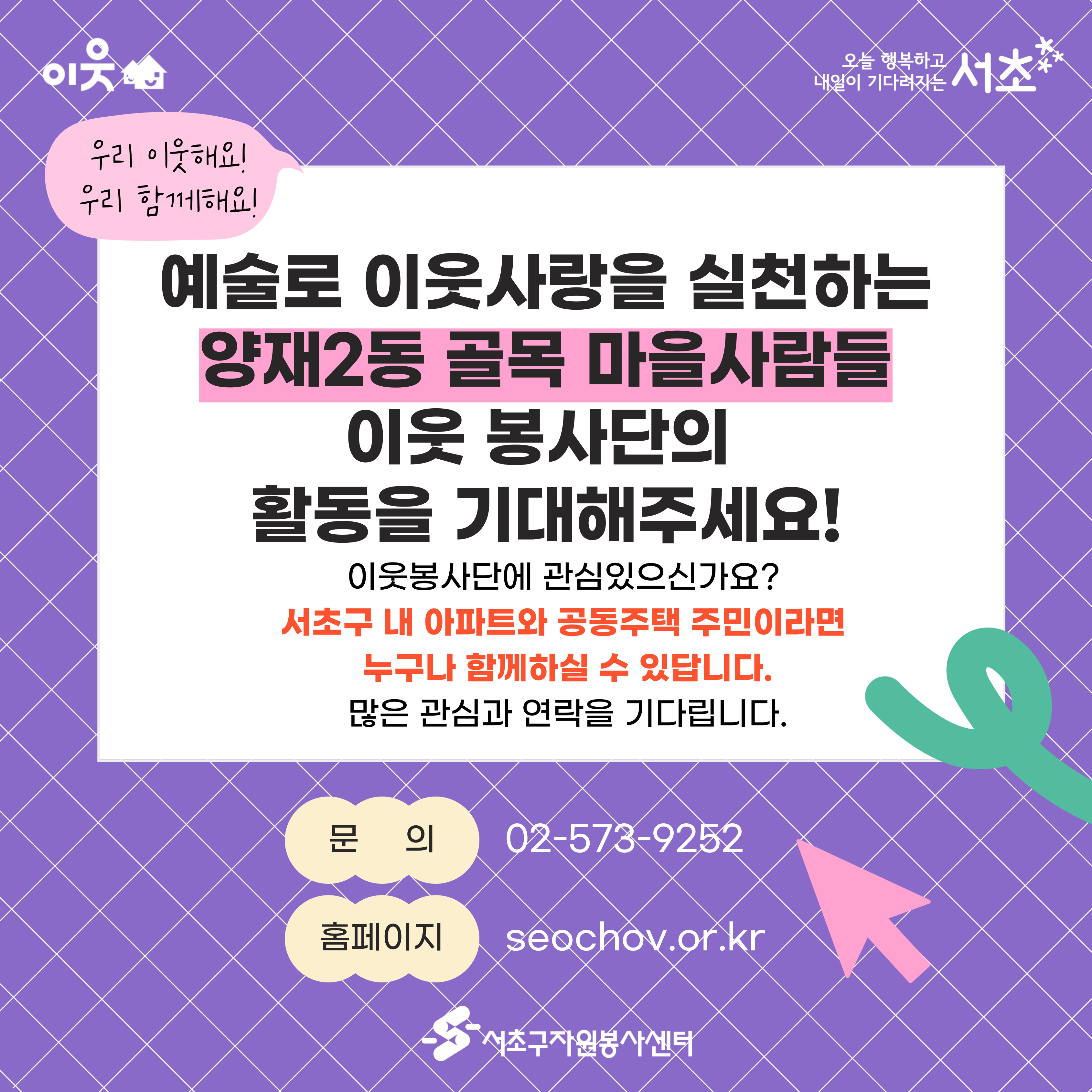 예술로 이웃사랑을 실천하는 양재2동 골목 마을사람들 이웃 봉사단의 활동을 기대해주세요!