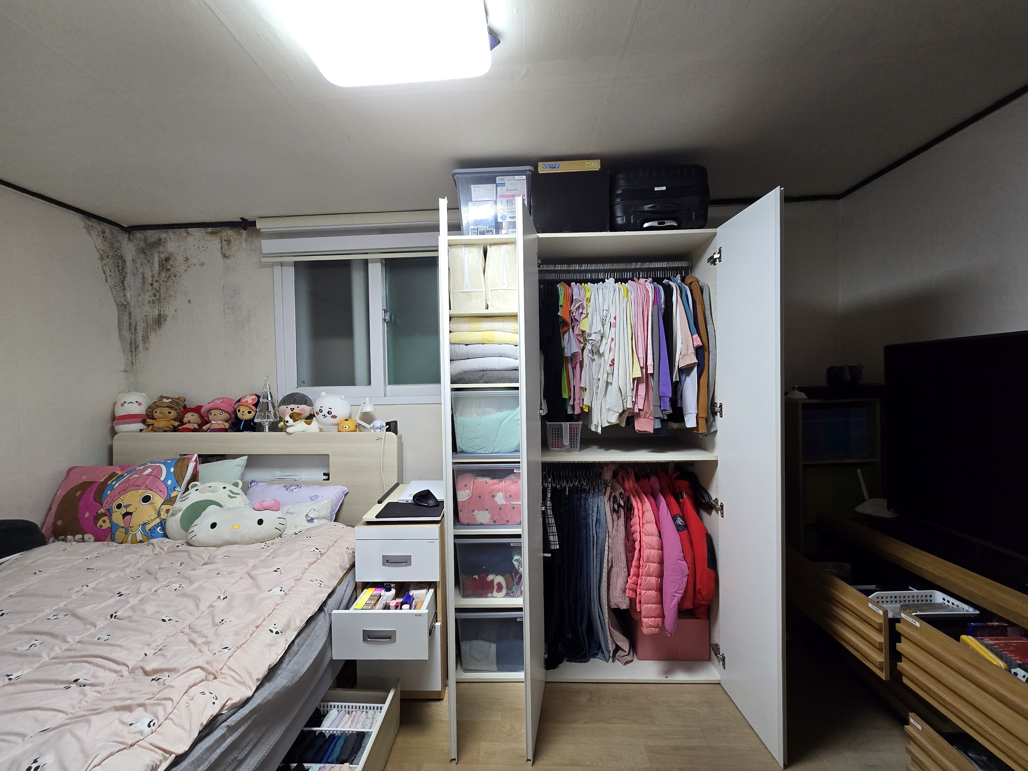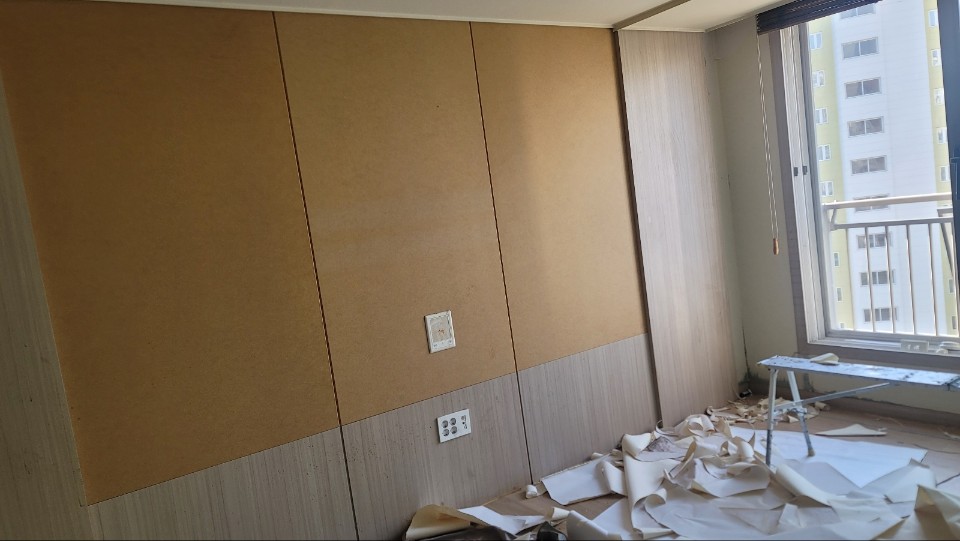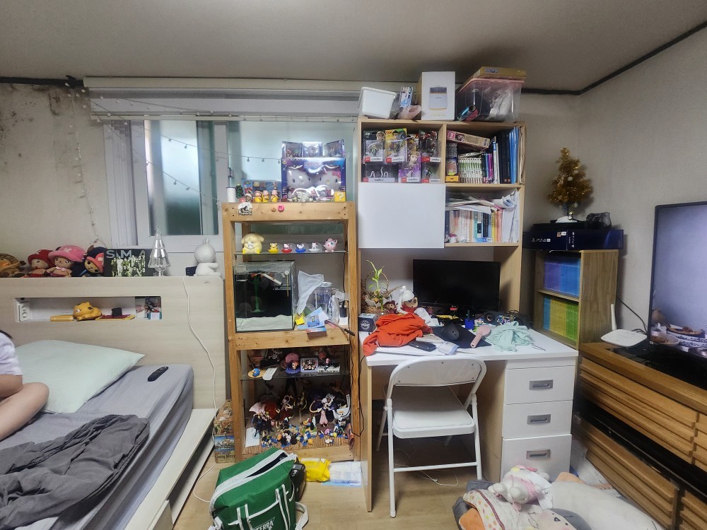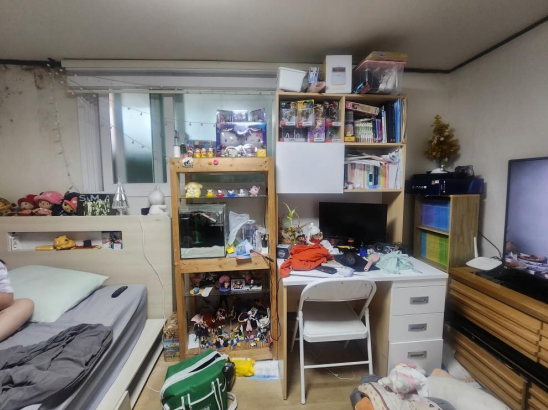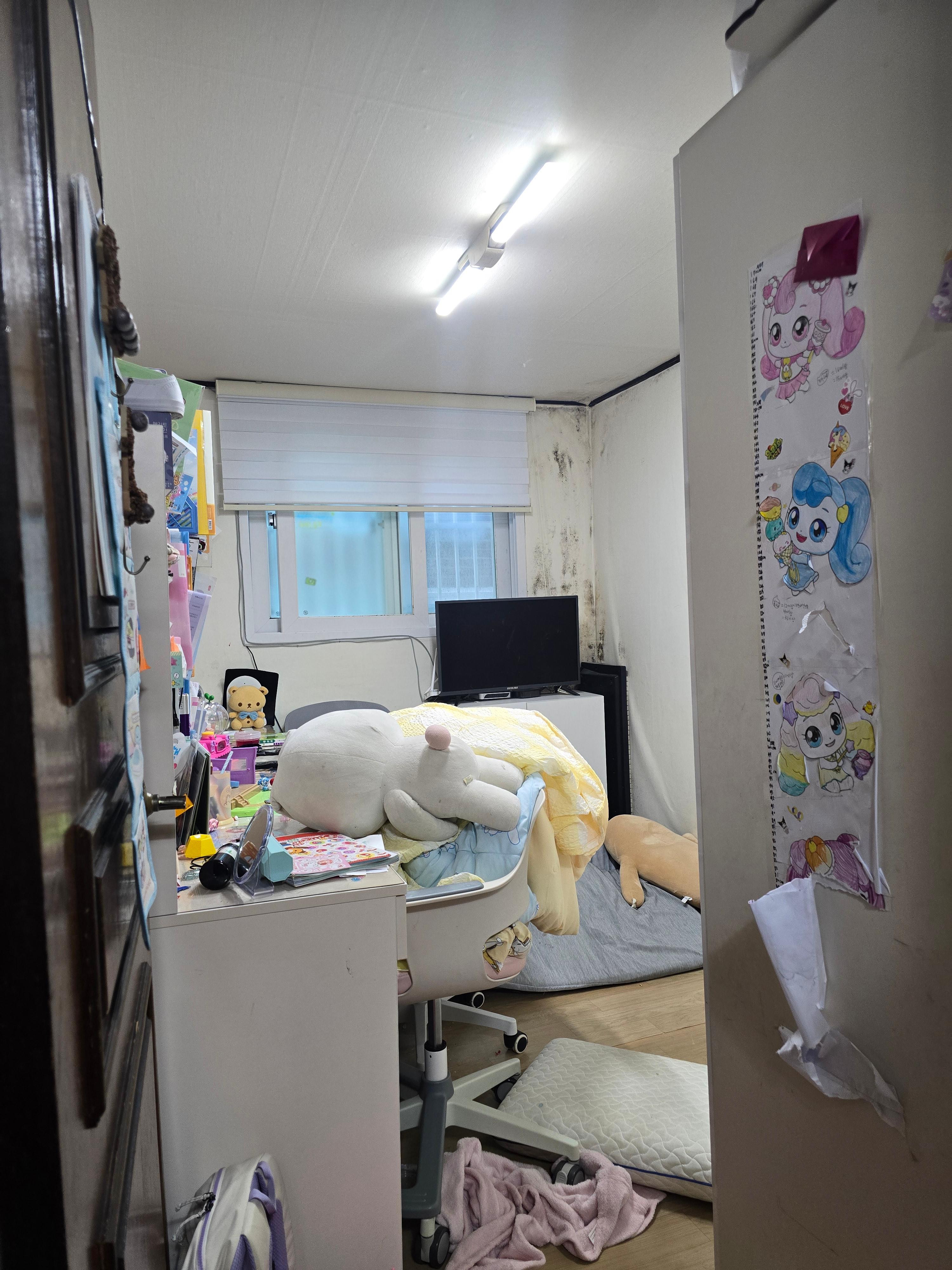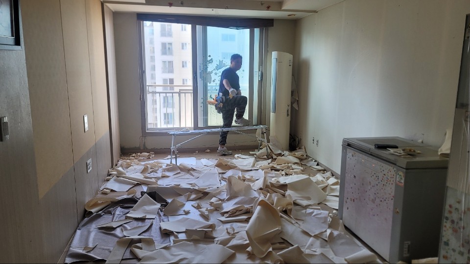 첫 번째, 대상 가구는 방하나와 거실로 구성된 주거공간에 부모님과 자녀 3명이 함께 생활하는 가정이였습니다. 그렇다보니 거실에서 생활하는 부모님의 생활의 분리가 필요하였고, 세월로 집안 구석구석 핀 곰팡이로 가구와 도배의 교체가 시급했습니다.