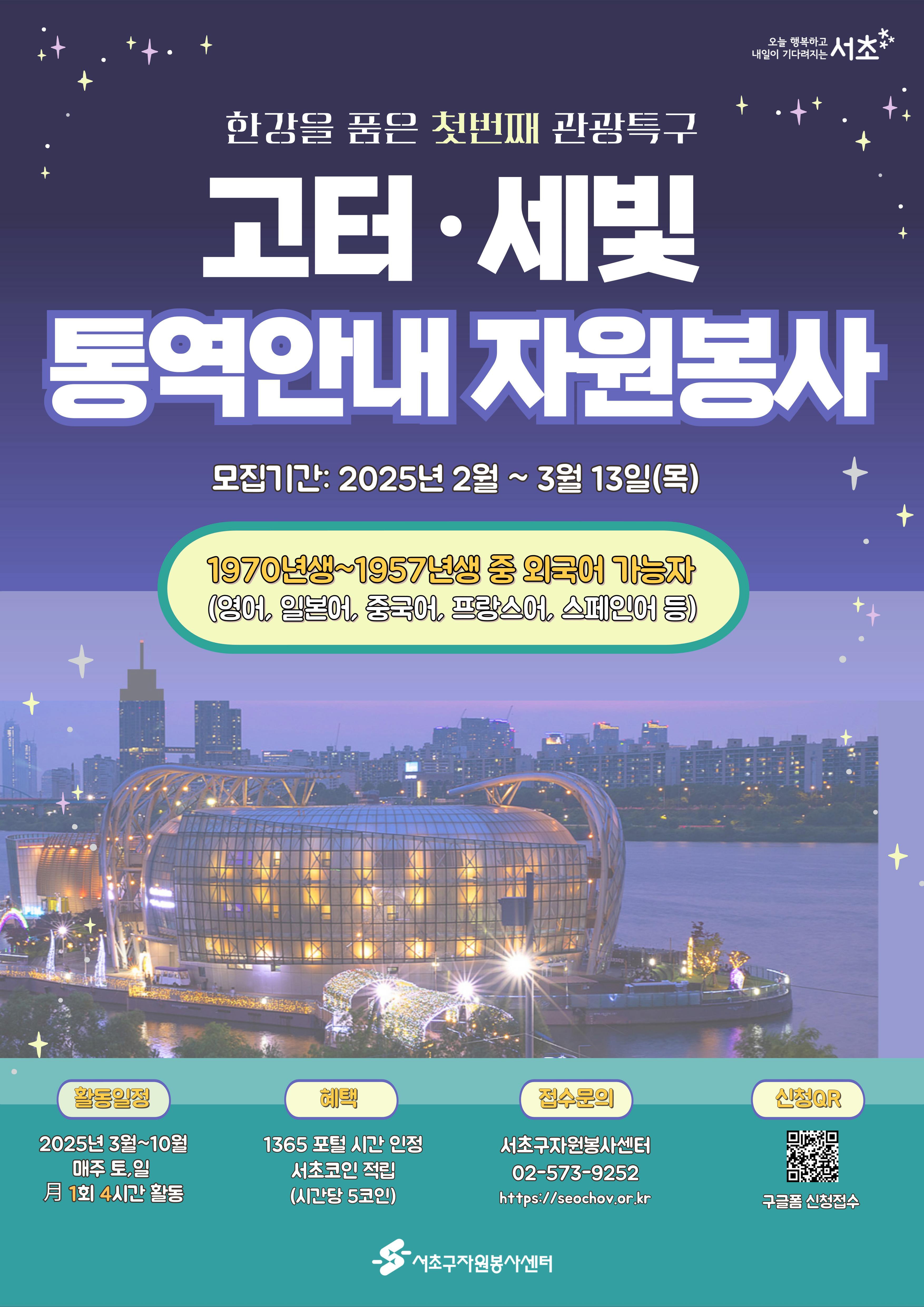 관광의 메카 고속버스터미널과 세빛섬을 이어주는 공공보행통로를 안내 할 고터·세빛 통역안내자원봉사자를 모집합니다. * 모집 기간 : 2025년 2월 ~ 3월 11일 * 모집 대상 : 1957년생 ~ 1970년생 외국