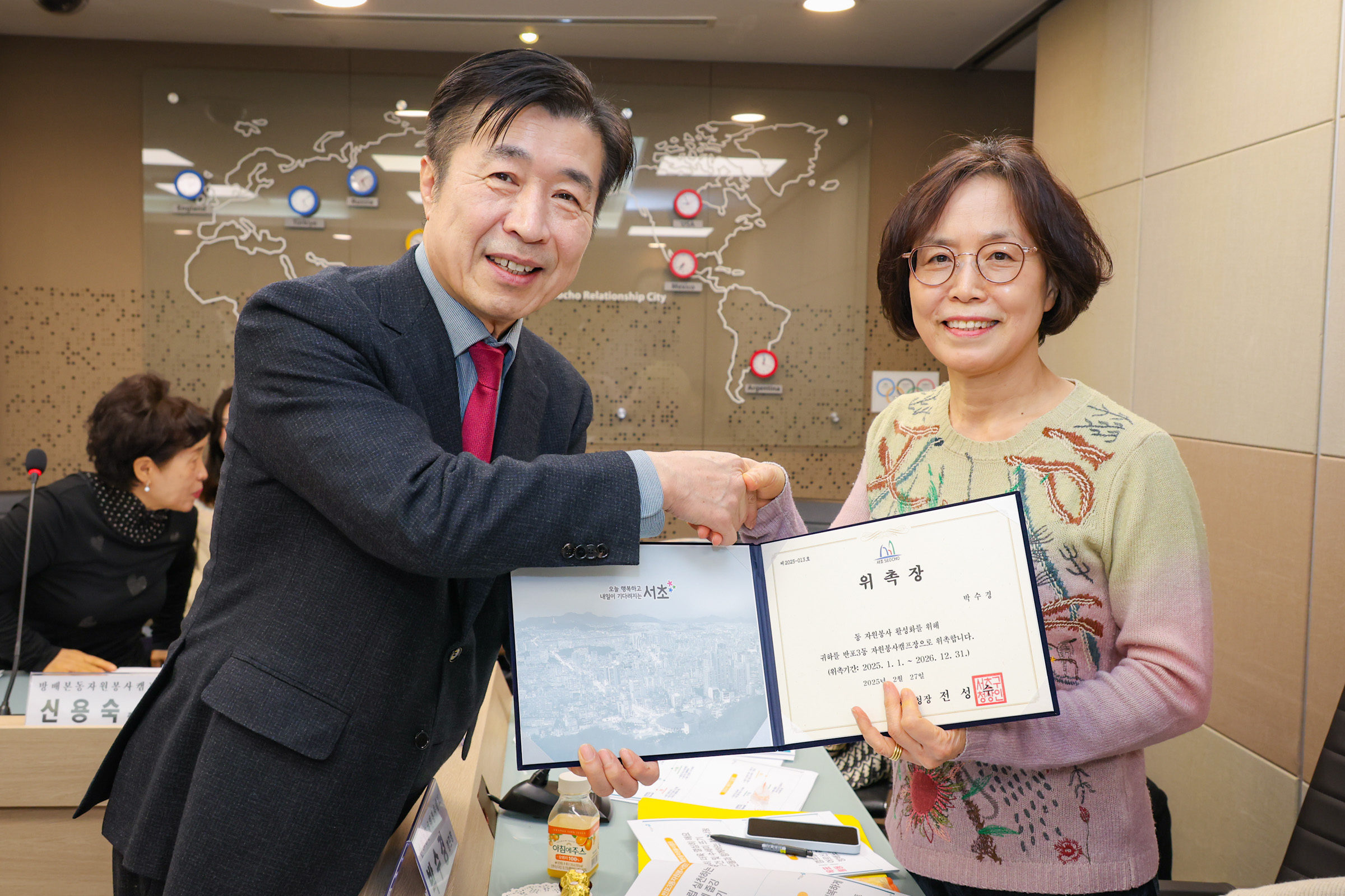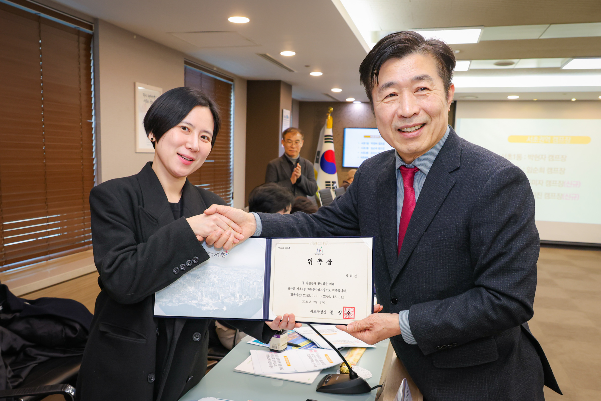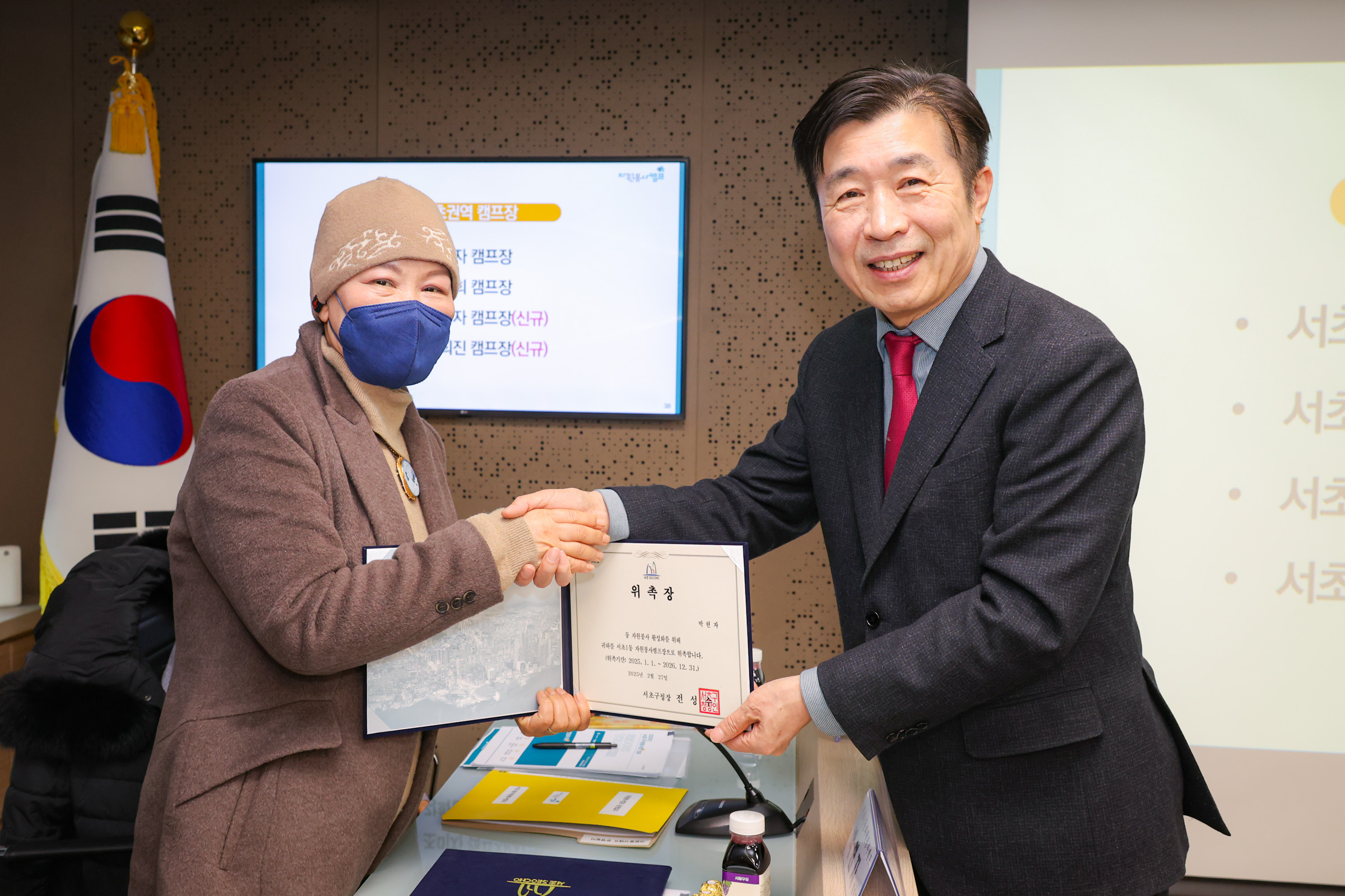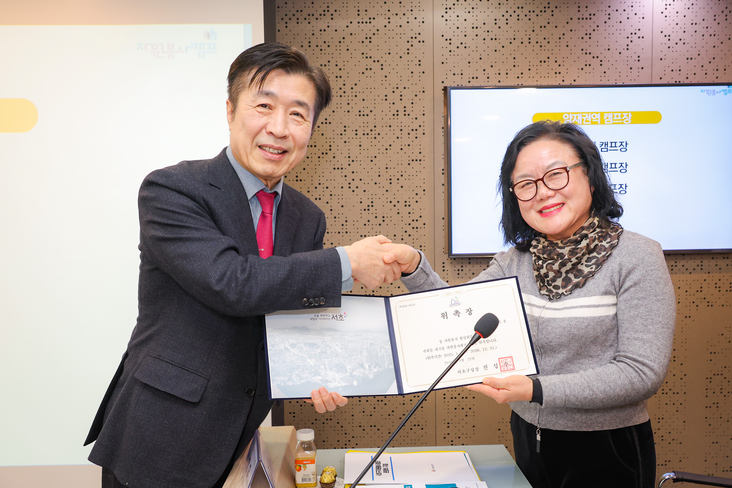 구청장님께서 직접 위촉장을 수여하시는 모습에서 자원봉사캠프에 대한 서초구의 남다른 관심과 지원 의지를 느낄 수 있었습니다😊👍