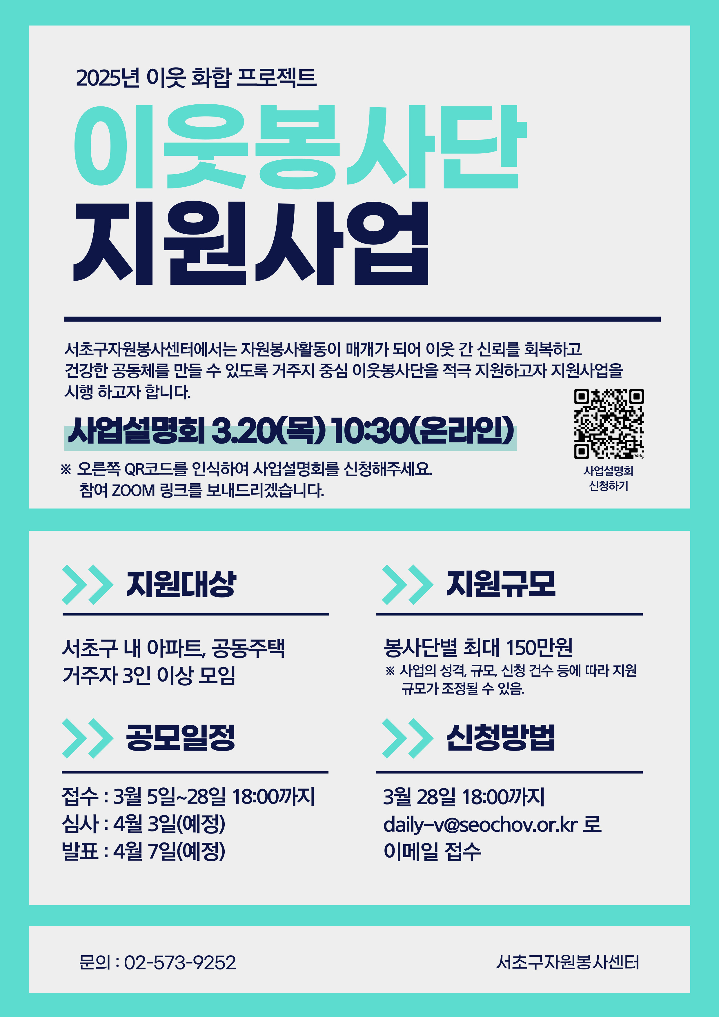서초구자원봉사센터에서는 자원봉사활동이 매개가 되어 이웃 간 신뢰를 회복하고 건강한 공동체를 만들 수 있도록 거주지 중심 이웃봉사단을 적극 지원하고자 공모사업을 시행하오니 많은 관심과 참여 바랍니다.