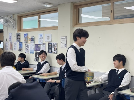 봉사활동의 사례를 잘 설명한 친구가 직접 간식을 나누어주고 있습니다.