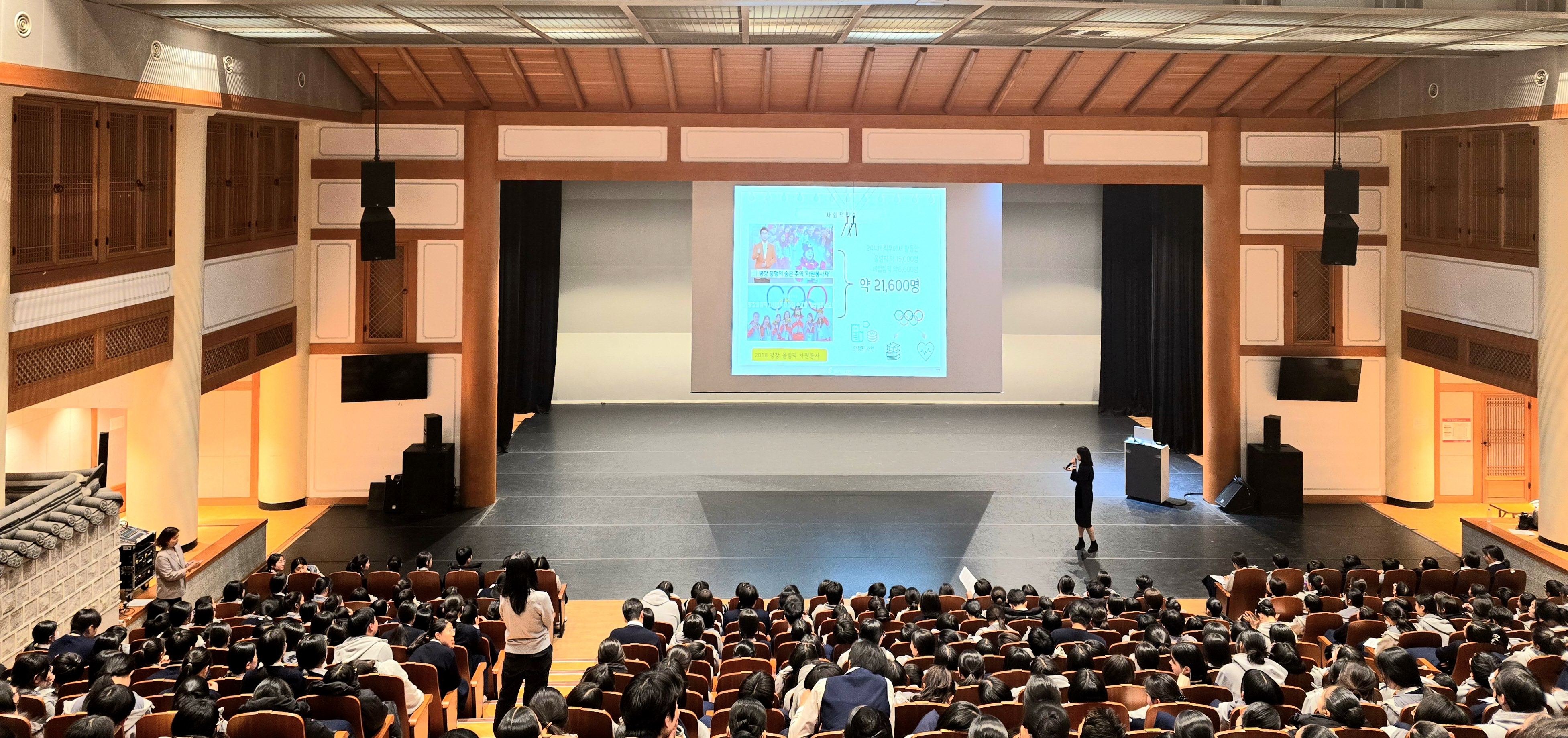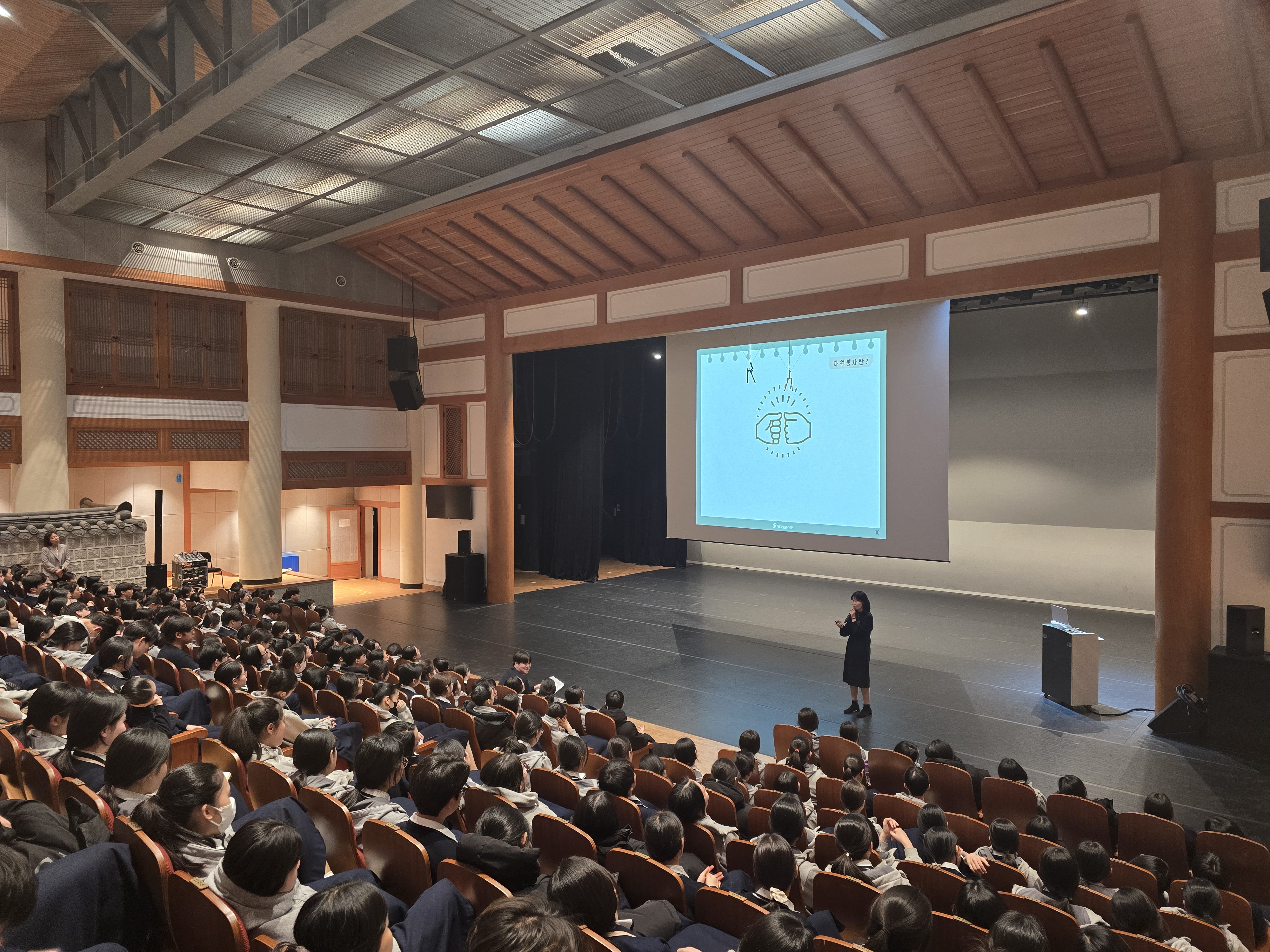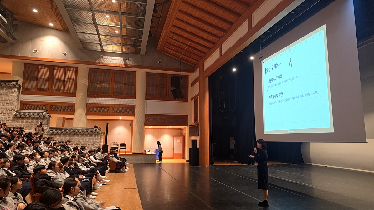 자원봉사의 정의부터 필요성, 사례에 이르기까지 다양한 주제의 이야기가 국악고 강당에 펼쳐졌습니다.