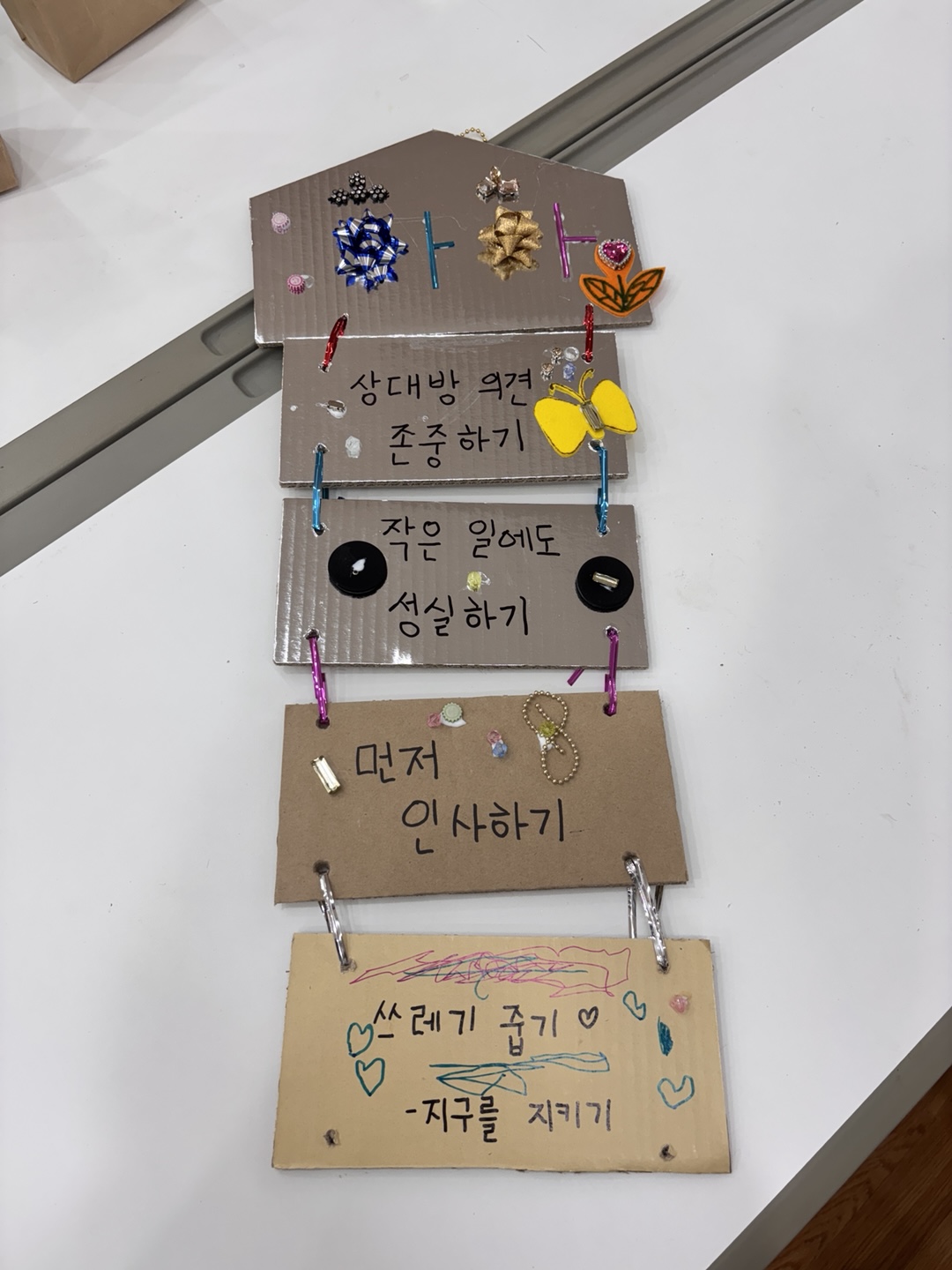 재활용품을 활용해 가족 이름, 봉사할 때 가질 자세, 실천할 봉사활동을 문패로 표현해 보는 시간이었는데요,