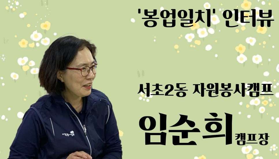 저는 임순희입니다. 현재 서초2동자원봉사캠프장 역을 맡고 있으며, 서울시자원봉사센터 ‘내곁에 자원봉사' 지원사업 통해 반찬나눔을 기획하여 이웃들과 따뜻한 정을 나누는 활동을 꾸준히 이어가고 있습니다.
